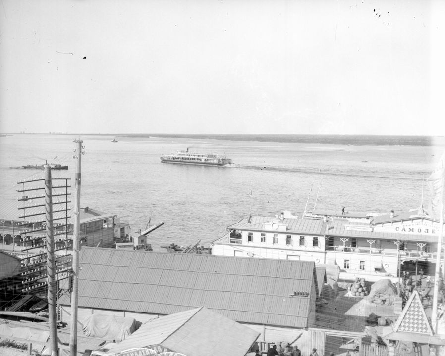 Вид на реку Волгу. На переднем плане - дебаркадер судоходного общества «Самолет». Автор: В.А. Зевеке Место события: г. Н.Новгород Дата: к. XIX - нач. ХХ вв.