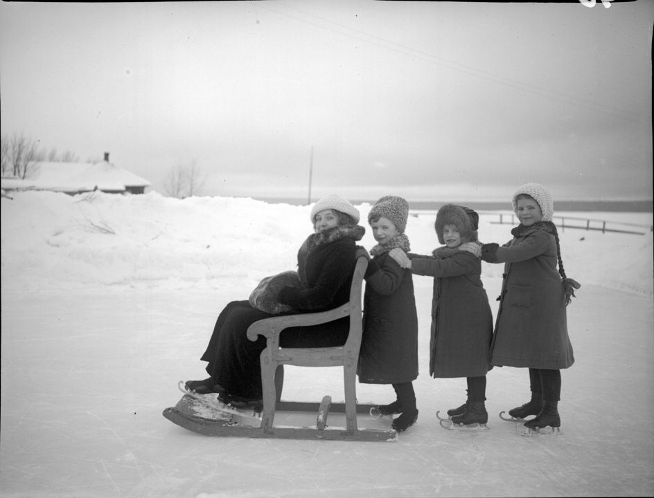 Неизвестная дама и трое детей на коньках. Автор: В.А. Зевеке Место события: г. Воткинск Дата: 1913 г.