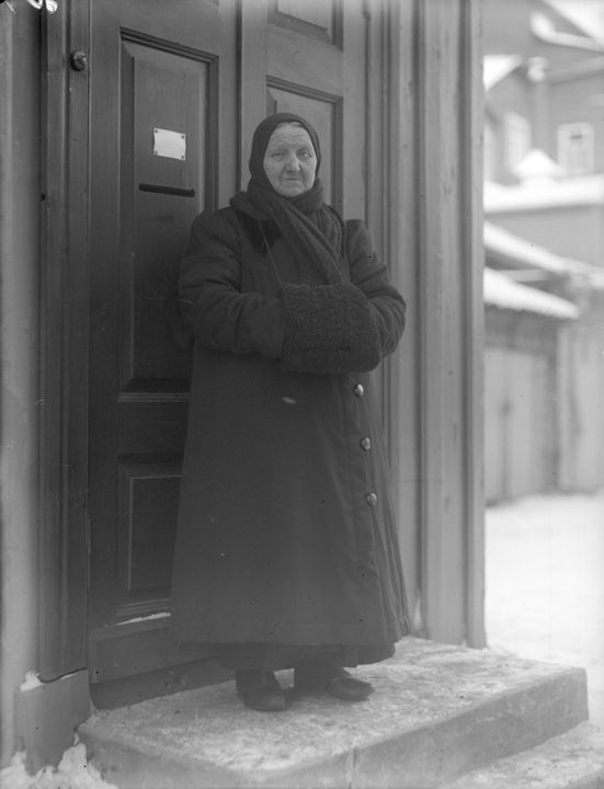 Пожилая женщина в платке, пальто, с муфтой, на пороге дома. Автор: В.А. Зевеке Место события: г. Воткинск Дата: 1915-1916 гг.