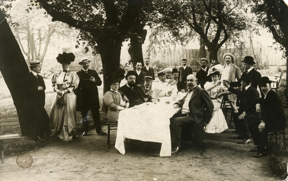 Наталия Павловна Дурдина с матерью и неизвестными женщинами у лестницы перед домом