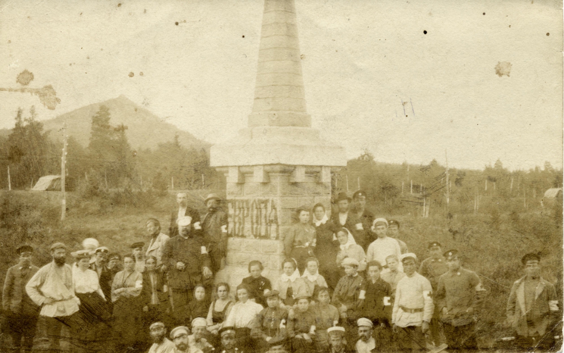Медики-добровольцы из Ярославской губернии у пограничного столба между Европой и Азией во время следования на фронт -Русско-Японская война 1904-1905 гг.-
