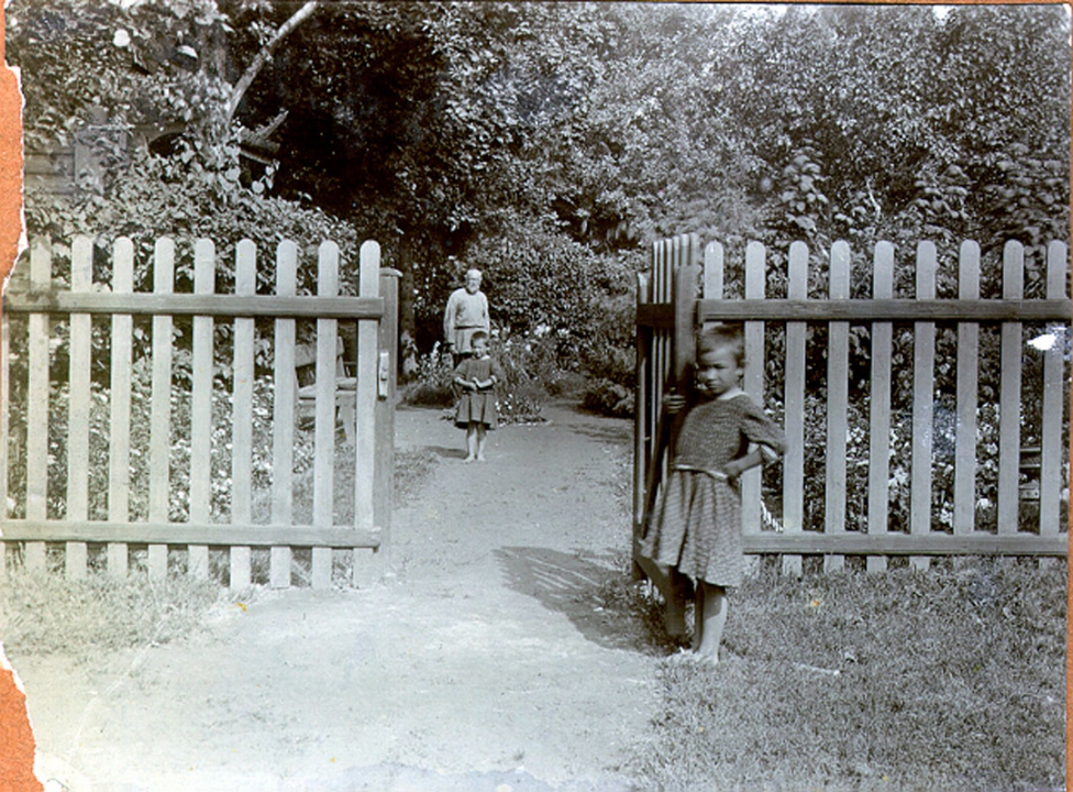 Наталия Павловна Дурдина с матерью и неизвестными женщинами у лестницы перед домом
