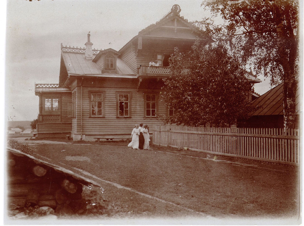 Наталия Павловна Дурдина с матерью и неизвестными женщинами у лестницы перед домом