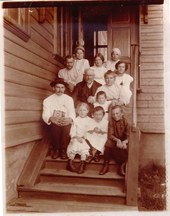 Наталия Павловна Дурдина с матерью и неизвестными женщинами у лестницы перед домом