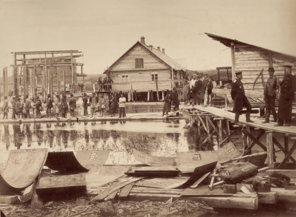 Вид бараков и устоя моста через реку Припять Виндаво-Рыбинской железной дороги
