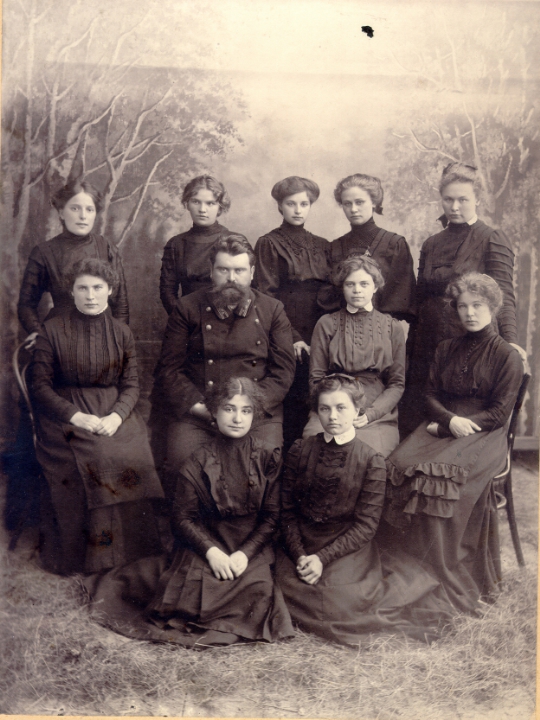Мария Алексеевна Золотарева с преподавателем и ученицами женской гимназии в Духовщине