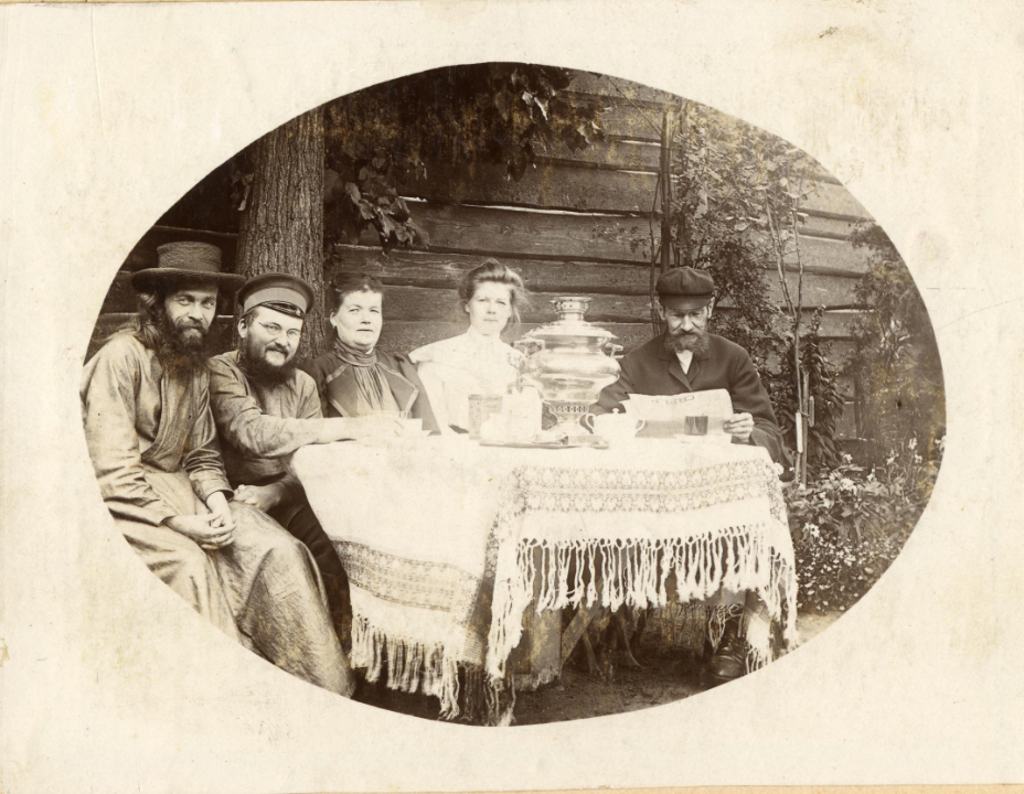 А.А.Ухтомский со священником Тихоно-Задонской церкви Фавстовым В.Д. (1-ый слева) и семьей Погодиных
