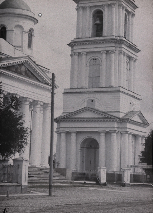 Ансамбль Крестовоздвиженской церкви в Рыбинске. Фрагмент южного фасада храма и колокольни.