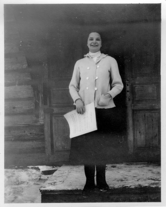 Наталия Павловна Дурдина на лестнице перед домом с неизвестными женщинами