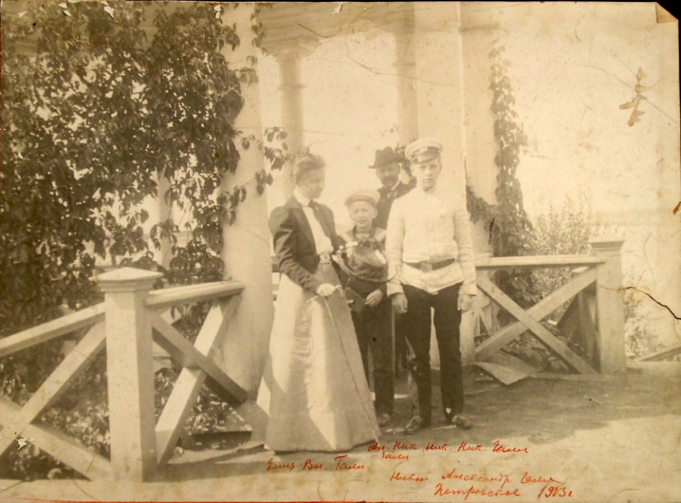 Наталия Павловна Дурдина с матерью и неизвестными женщинами у лестницы перед домом