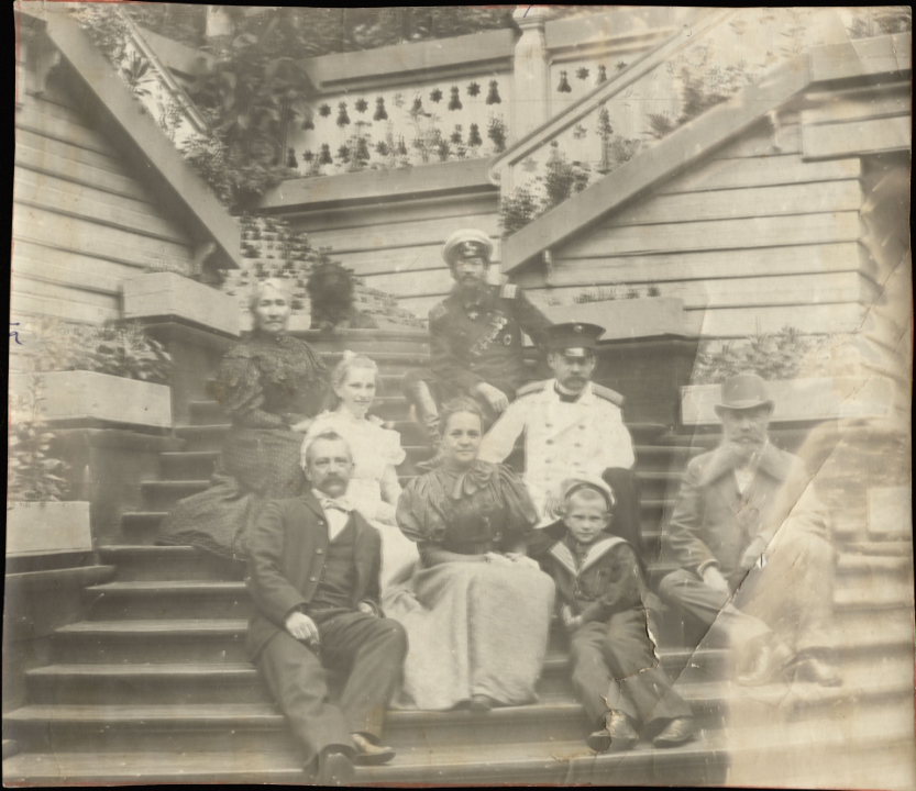 Наталия Павловна Дурдина с матерью и неизвестными женщинами у лестницы перед домом
