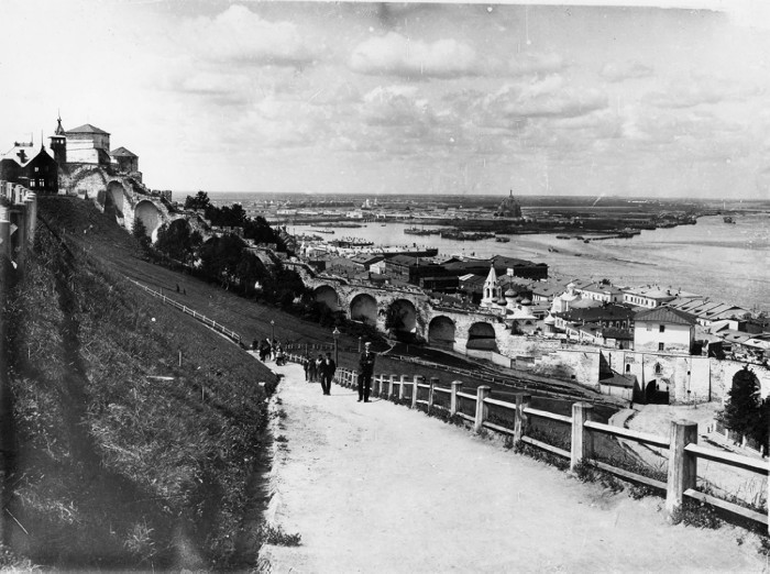 Вид на кремлевскую стену (на переднем плане) и ярмарочную сторону (на заднем плане). к. XIX в. г. Нижний Новгород