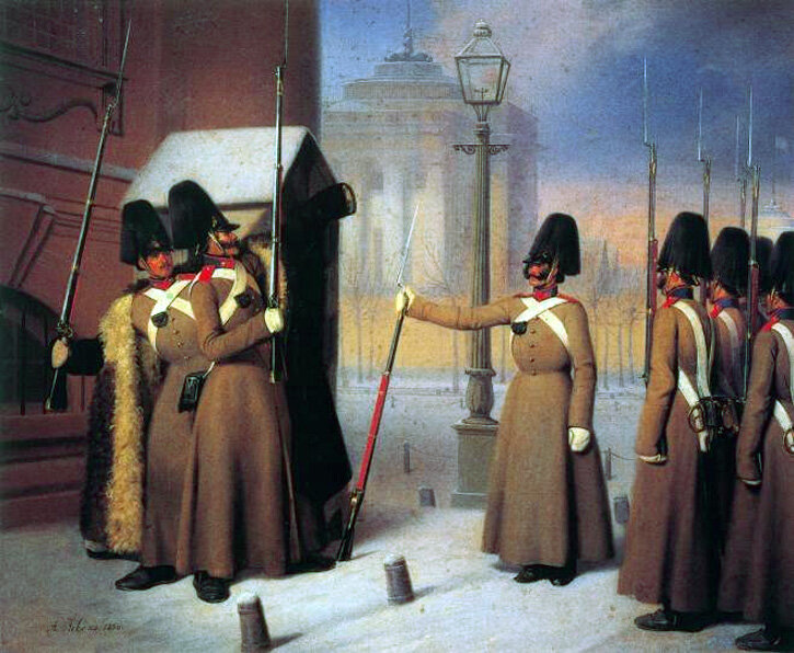 a:2:{s:4:"TEXT";s:319:"Показан караульный тулуп, передаваемый старым часовым новому. Впервые в Русской Армии эти тулупы были введены императором Павлом I. До него солдат на посту должен был спасаться от холода своими средствами. Изображенный прием передачи тулупа новому часовому не изменился с тех пор и используется в современной армии. ";s:4:"TYPE";s:4:"html";}