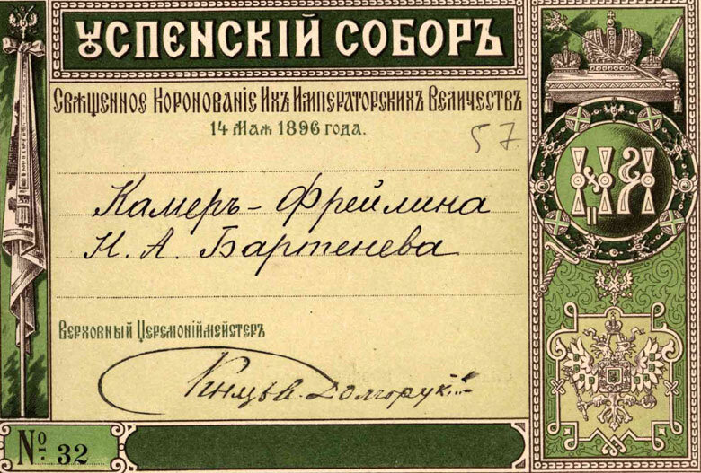 Билет принадлежал камер-фрейлине Н.А. Бартеневой.