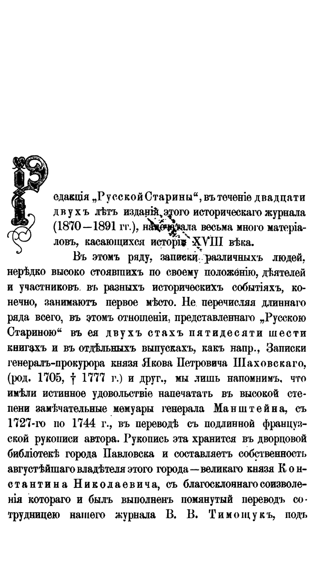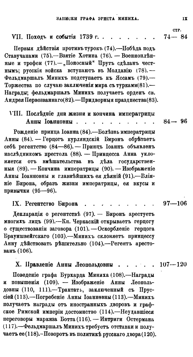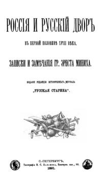 Редакция исторического журнала «Русская старина» за годы своей деятельности напечатала довольно много материалов, касающихся истории XVIII века. Благодаря этому изданию, в настоящей книге собраны труды графа Эрнста Миниха (1707-1788), сына знаменитого фельдмаршала Бурхарда Христофора Миниха. Сочинения графа содержат подробную информацию об эпохе русской истории от кончины Петра Великого до восшествия на престол Елизаветы Петровны. Будучи успешным политическим деятелем и дипломатом, Миних пользовался благосклонностью императрицы Анны Иоанновны, а после её смерти — Анны Леопольдовны. В своих заметках граф рассказывает о современных ему событиях: глазами очевидца представлены быт и нравы двора, частная жизнь Анны Иоанновны, Бирона и Анны Леопольдовны. Миних описывает дворцовые интриги, заговоры и перевороты, возвышения и падения временщиков, опалы и казни, взаимоотношения монархов и вельмож.