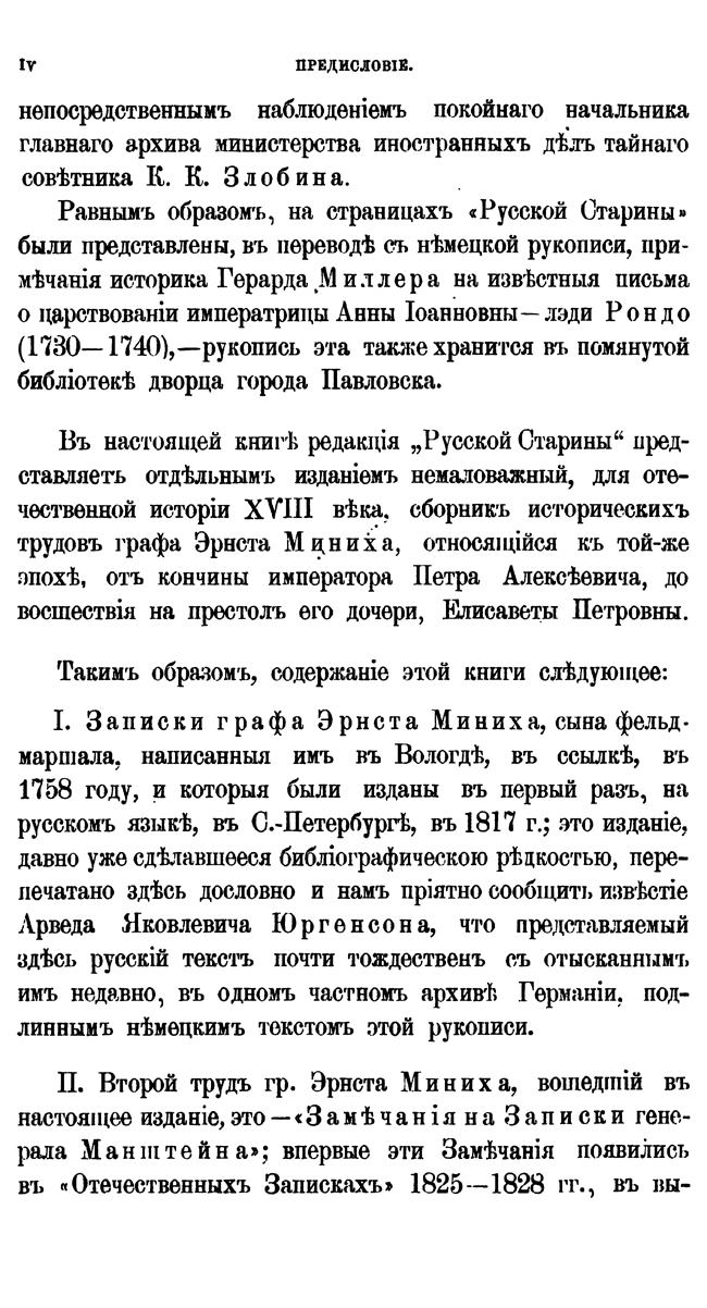 В сборник включены «Записки графа Эрнста Миниха» (1817), написанные им в Вологде в ссылке в 1758 году. Впервые на русском языке они были изданы в Санкт-Петербурге в 1817 году.