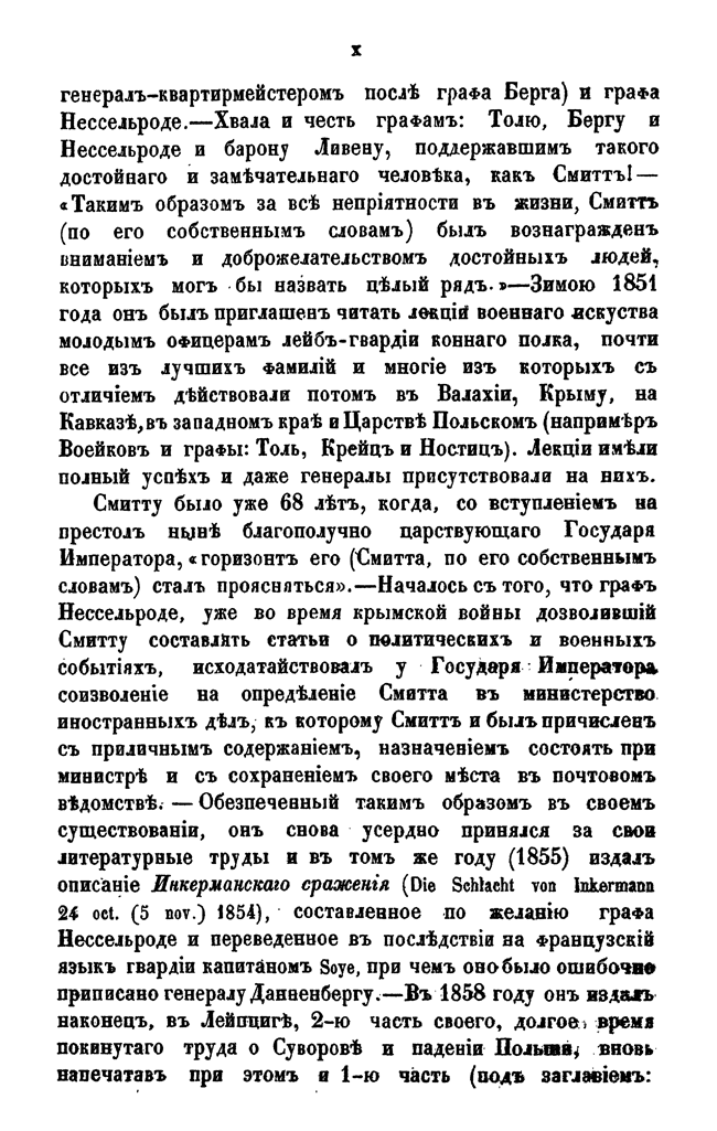 Эта книга долгое время считалась наиболее ценнной биографией великого русского полководца. Несмотря на название, основное внимание уделено имено жизни самого Суворова, Для себя Смитт выдвинул следующие цели: 1) изобразить правдиво падение Польской республики и, в тоже время, жизнь и подвиги Суворова 2) опровергнуть ложное мнение о Суворове, существовавшее в Западной Европе и, особенно, Германии 3) показать актами и документами истинное величие такого человека, как Суворов. Со всеми этими задачами автор вполне справился.