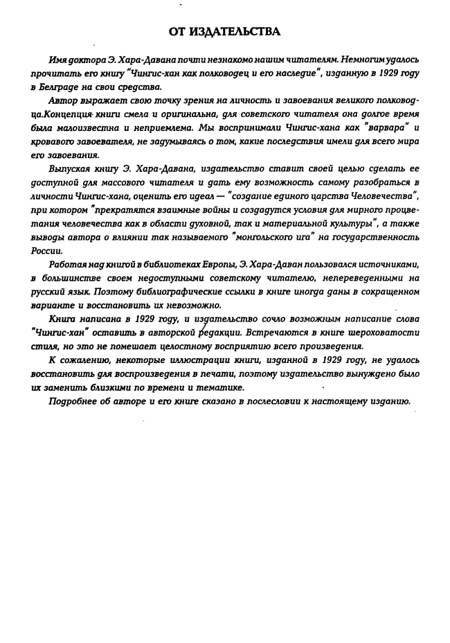 Доктор Э. Хара-Даван издал книгу «Чингис-Хан как поководец и его наследие» в 1929 году на собственные средства. Автор выражает свою точку зрения на личность и завоевания великого полководца. Идеалом Чингис-хана было «создание единого царства Человечества», при котором «прекратятся взаимные войны и создадутся условия для мирного процветания человечества как в области духовной, так и материальной культуры». Автор делает выводы о влиянии «монгольского ига» на государственность России.