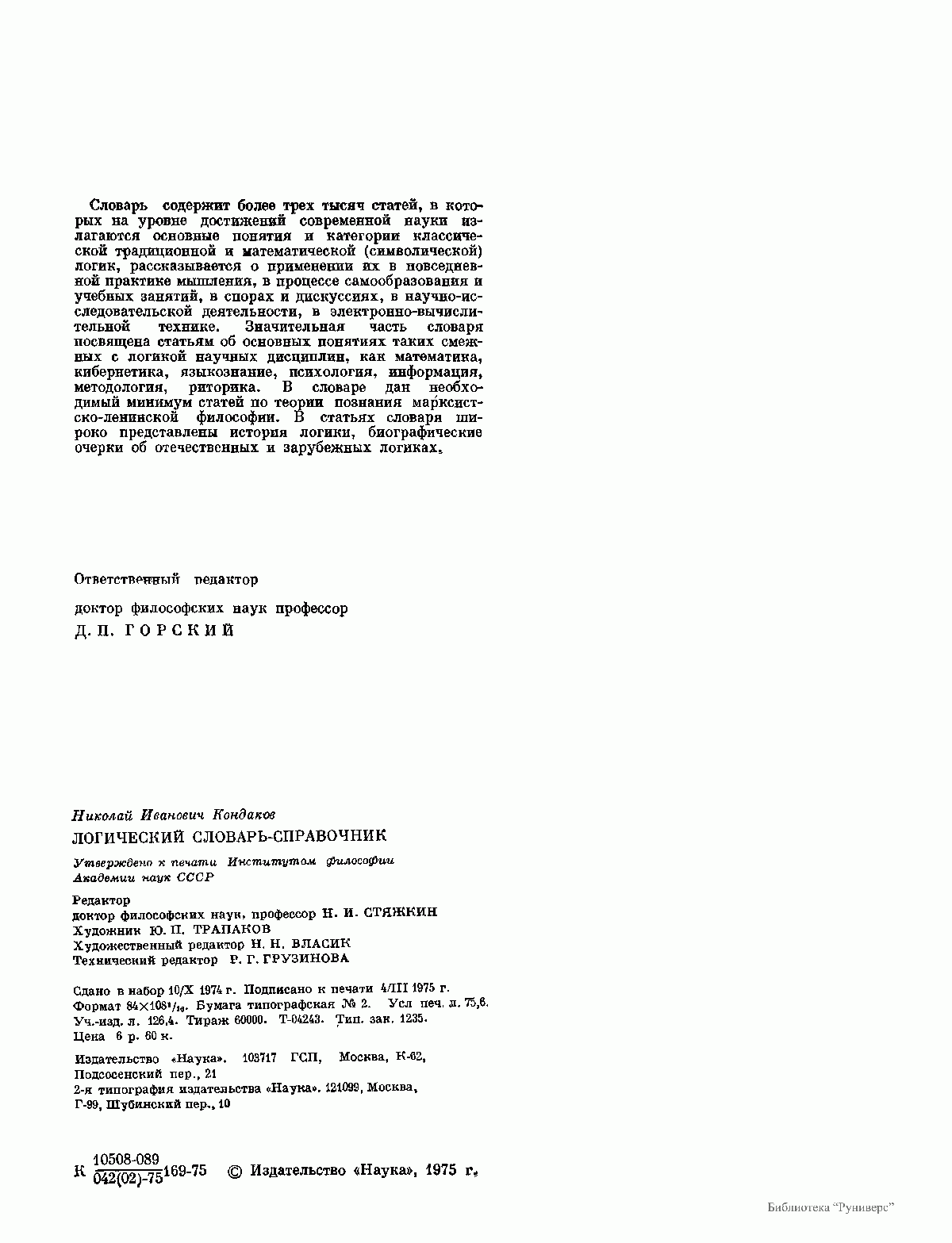 Словарь содержит более трех тысяч статей, в которых на уровне достижений современной науки излагаются основные понятия и категории классической традиционной и математической (символической) логик, рассказывается о применении их в повседневной практике мышления, в процессе самообразования и учебных занятий, в спорах и дискуссиях, в научно-исследовательской деятельности, в электронно-вычислительной технике.