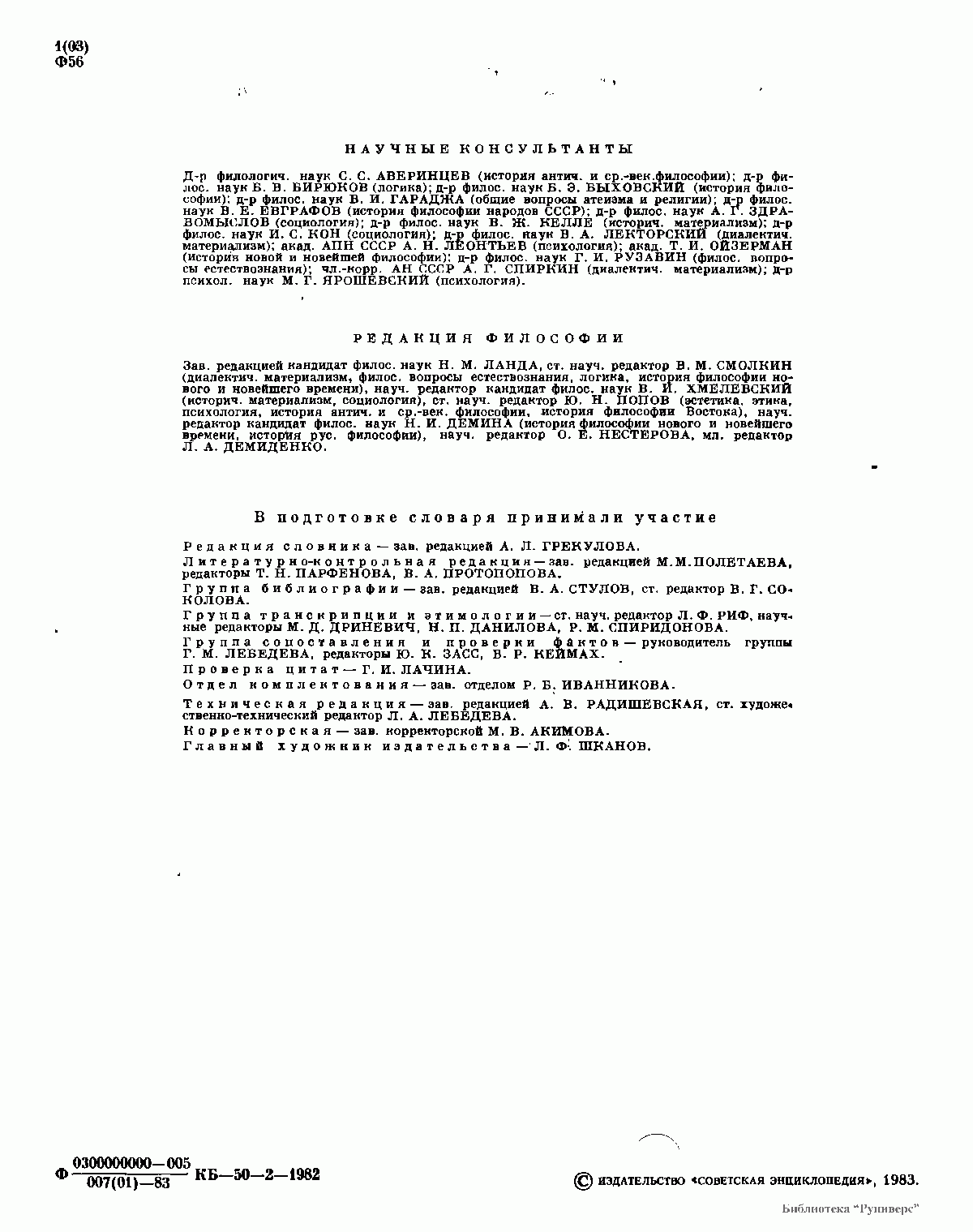 В Философском энциклопедическом словаре, включающем около 2000 статей, освещаются проблемы диалектического и исторического материализма, философские вопросы естествознания, социология, этика, эстетика, философские проблемы психологии, логики, атеизма, религии, дана панорама мирового развития философии. Большое число статей посвящено философам, социологам, психологам, повлиявшим на развитие философии и всей общественной мысли. (Гл.ред.: