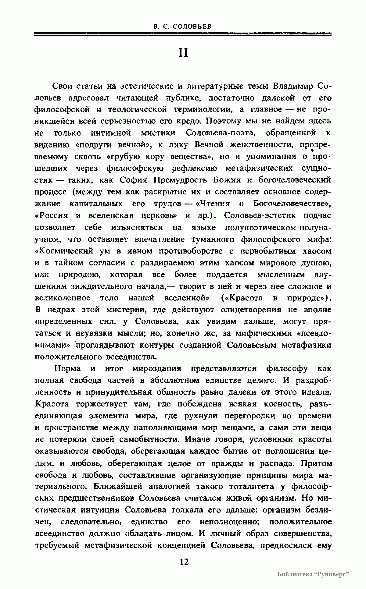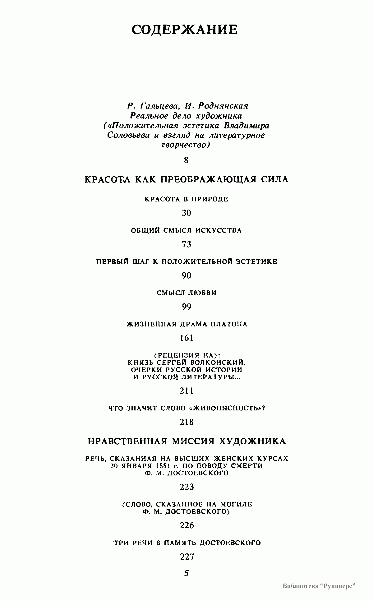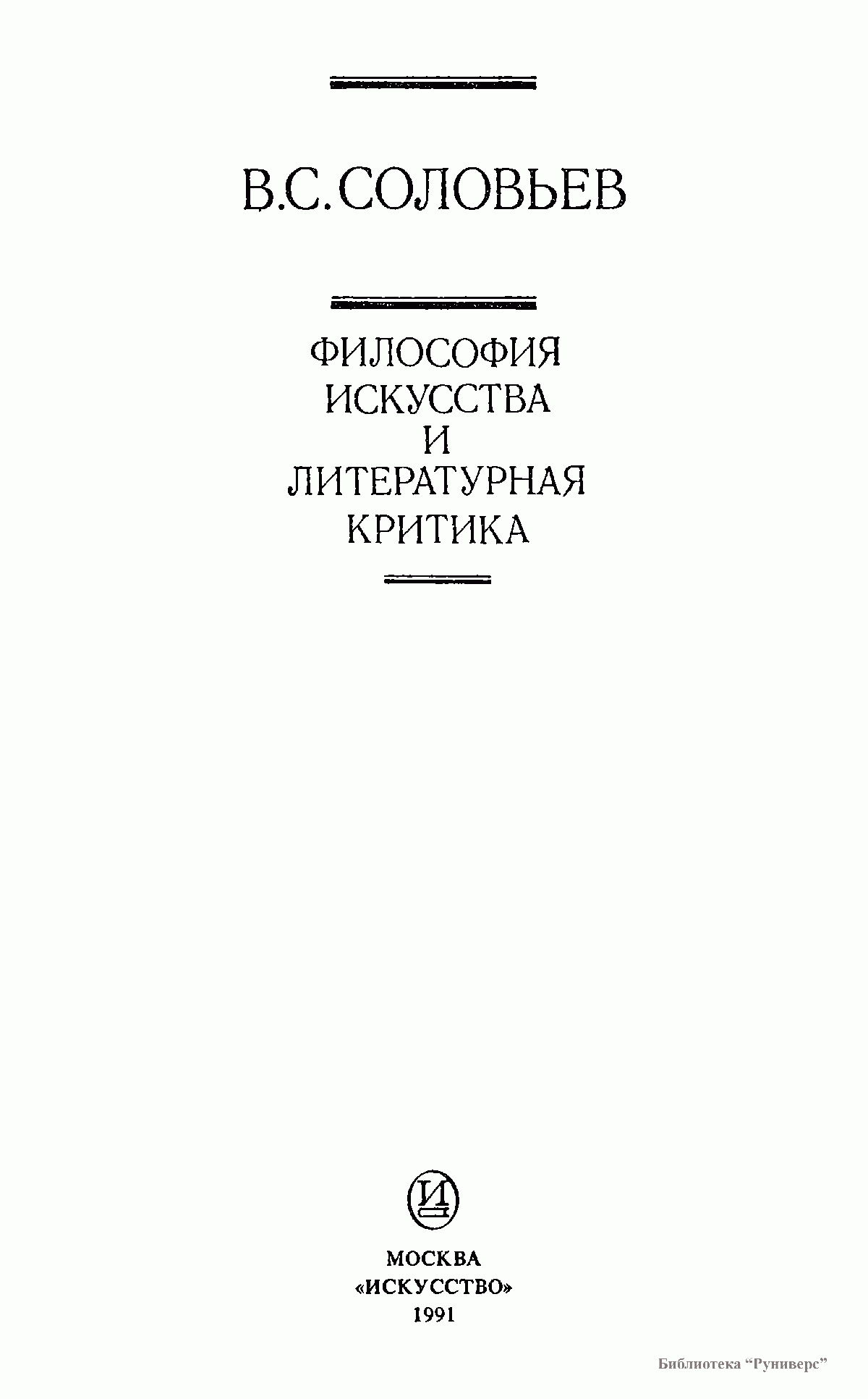 Владимир Сергеевич Соловьев (1853—1900) — крупнейшая фигура в умственной, общественной и культурной жизни России последней трети XIX века. Мыслитель и поэт, он выступил завершителем целой эпохи философских исканий и дал толчок новым идейным и художественным течениям XX века, в особенности символизму. Включенные в сборник сочинения В. С. Соловьева в соответствии с важнейшими темами его эстетической мысли распределены по следующим разделам: «Красота как преображающая сила», «Нравственная миссия художника», «Статьи о русских поэтах», «Энциклопедические статьи. Рецензии. Заметки».