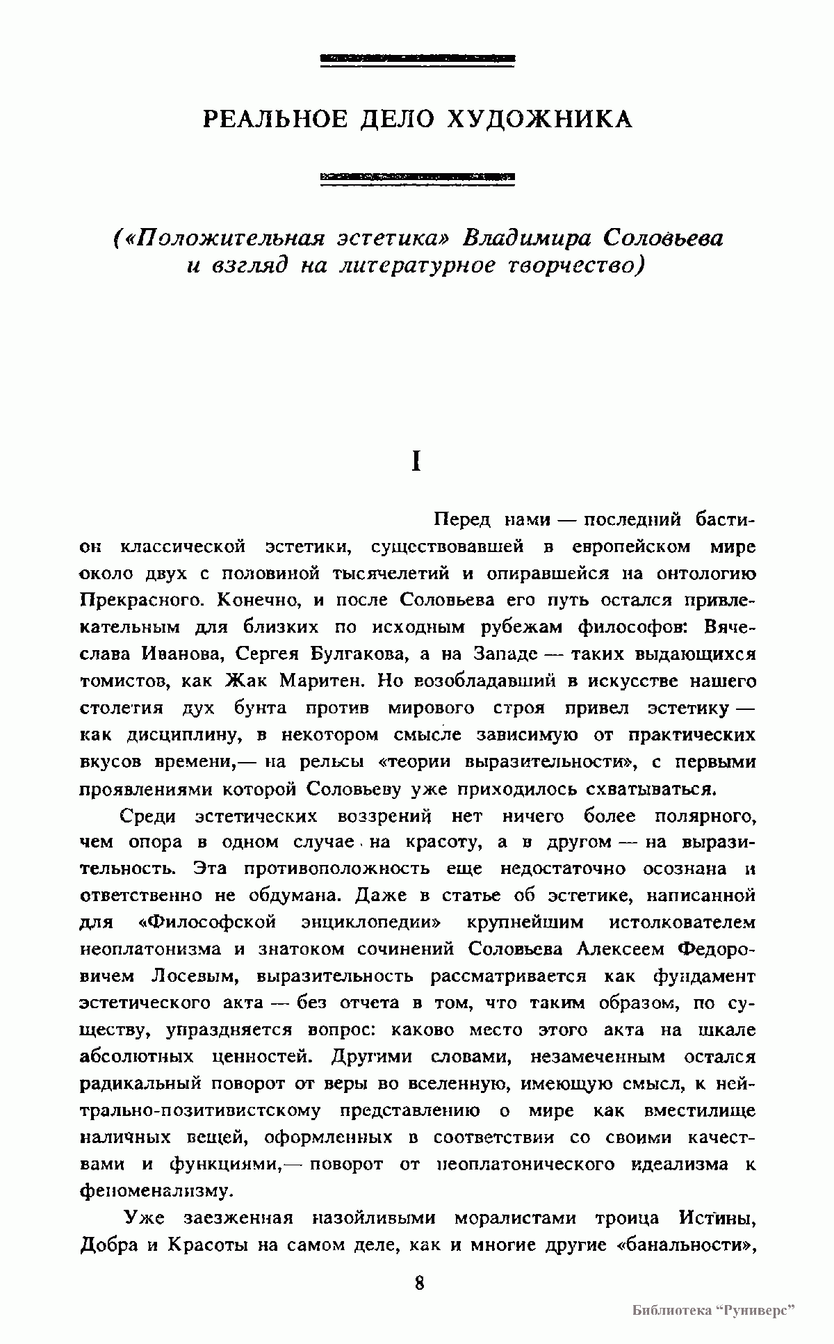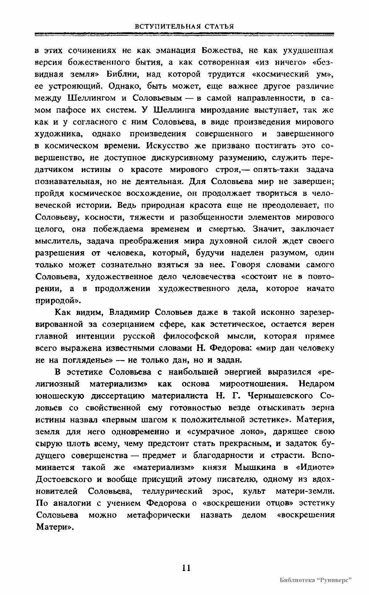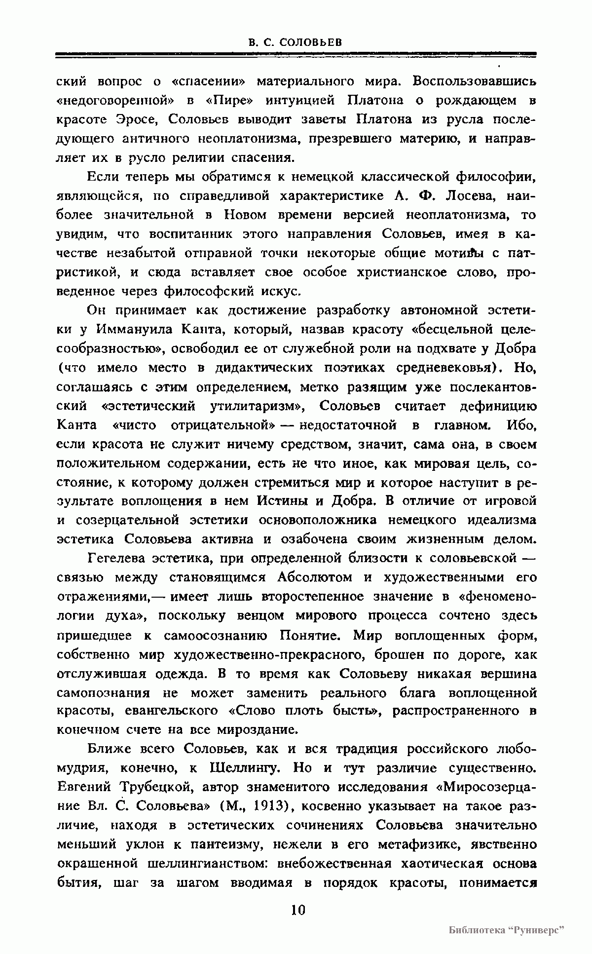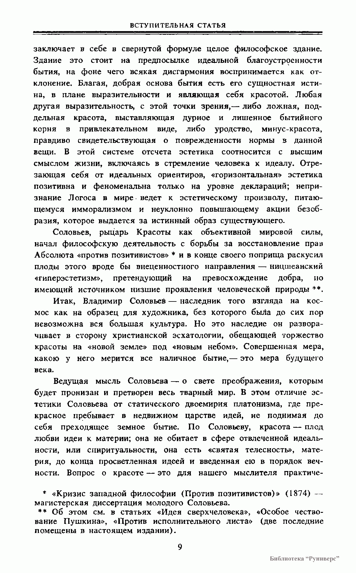 Владимир Сергеевич Соловьев (1853—1900) — крупнейшая фигура в умственной, общественной и культурной жизни России последней трети XIX века. Мыслитель и поэт, он выступил завершителем целой эпохи философских исканий и дал толчок новым идейным и художественным течениям XX века, в особенности символизму. Включенные в сборник сочинения В. С. Соловьева в соответствии с важнейшими темами его эстетической мысли распределены по следующим разделам: «Красота как преображающая сила», «Нравственная миссия художника», «Статьи о русских поэтах», «Энциклопедические статьи. Рецензии. Заметки».