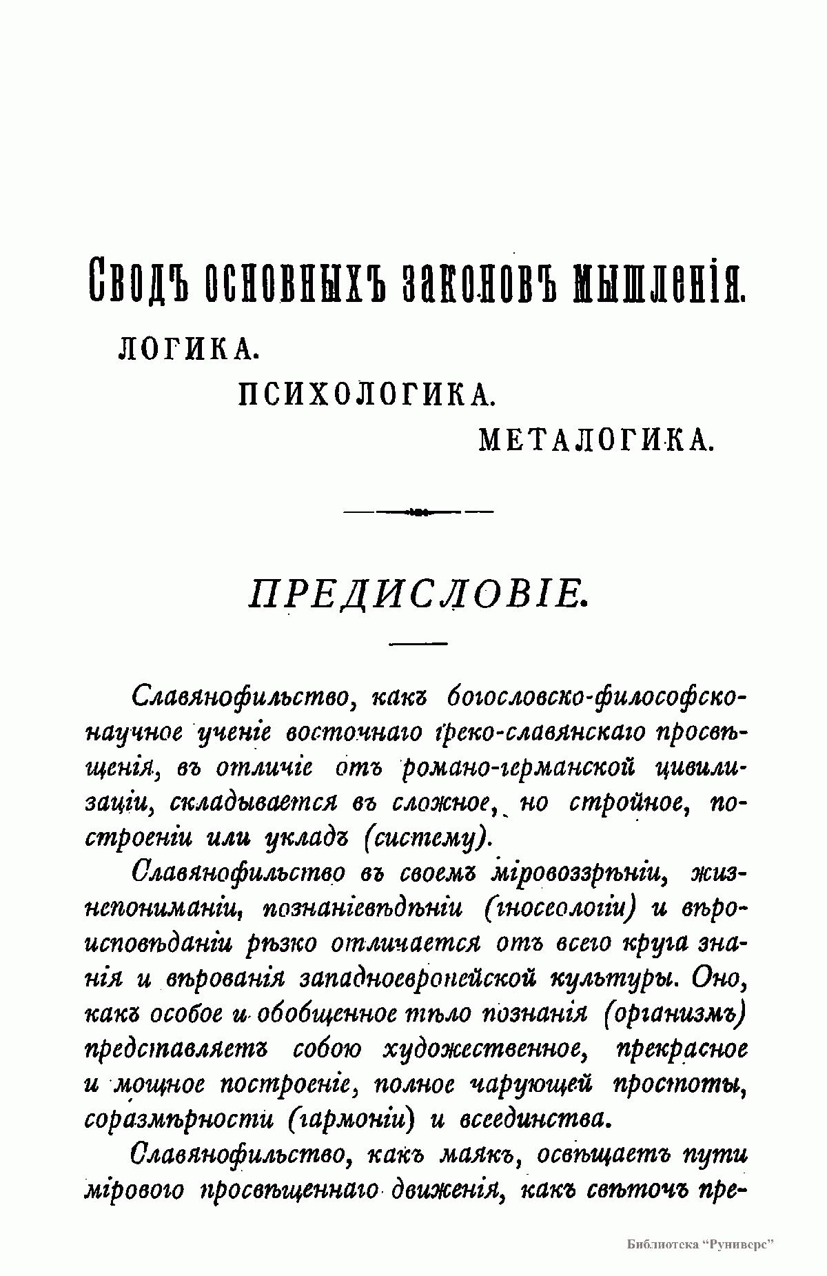 Славянофильство, как богословско-философско-научное учение восточного греко-славянского просвещения в отличие от романо-германской цивилизации складывается в сложное, но стройное, построение или уклад (систему). Славянофильство в своем мировоззрении, жизнепонимании познаниеведении (гносеологии) и вероисповедании резко отличается от всего круга знания и верования западноевропейской культуры. Оно, как особое и обобщенное тело познания (организм) представляет собою художественное, прекрасное и мощное построение, полное чарующей простоты, соразмерности (гармонии) и всеединства. По своей исполинской обширности и всеобъемному обхвату славянофильство не может удовлетвориться и ограничиться тремя или четырьмя законами элементарной и к тому-же исключительно формальной логики Аристотеля. Поэтому, задаваясь целью изложить философию по славянофильству, в строгом порядке и цельности, мы начнем нашу работу сводом основных законов мысли, поскольку он необходим для обоснования всего движения славянофильского просвещения, и установим образец и построение этих законов. Сие основное построение законов мысли и будет служить нам для дальнейших постановок всяких укладов, но они не будут беспочвенны, а, наоборот, обоснованы на точных и незыблемых законах самой мысли. При этом постараемся наше изложение и даже построение выразить, для большей отчетливости и определенности, числовыми и геометрическими (математическими) образами.