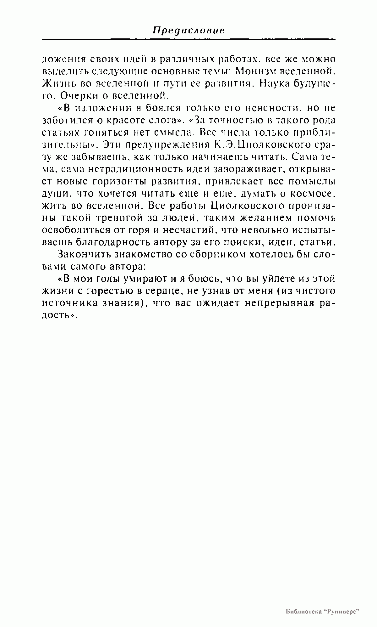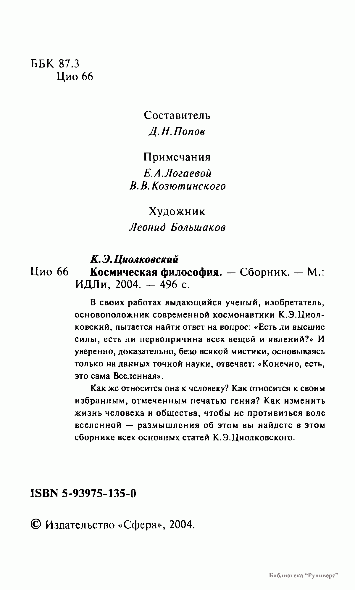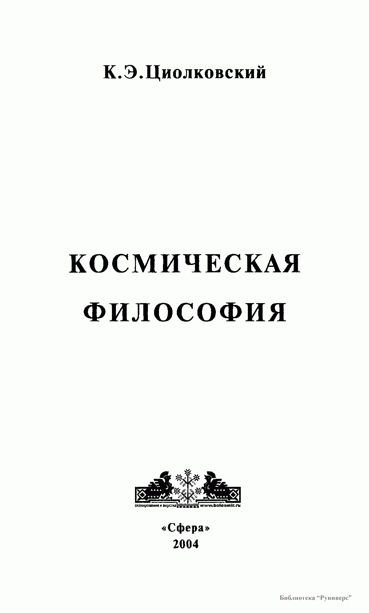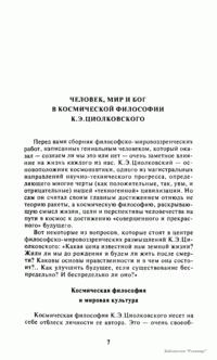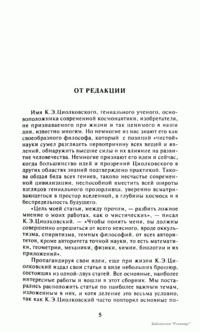 "Цель моей статьи, между прочим, — разбить ложное мнение о моих работах, как о мистических», чтобы понять меня, вы должны совершенно отрешиться от всего неясного, вроде оккультизма, спиритизма, темных философий, от всех авторитетов, кроме авторитета точной науки, то есть математики, геометрии, механики, физики, химии, биологии и их приложений." (К.Э.Циолковский) В своих работах выдающийся ученый, изобретатель, основоположник современной космонавтики К.Э.Циолковский, пытается найти ответ на вопрос: «Есть ли высшие силы, есть ли первопричина всех вещей и явлений?» И уверенно, доказательно, безо всякой мистики, основываясь только на данных точной науки, отвечает: «Конечно, есть, это сама Вселенная». Как же относится она к человеку? Как относится к своим избранным, отмеченным печатью гения? Как изменить жизнь человека и общества, чтобы не противиться воле вселенной — размышления об этом вы найдете в этом сборнике всех основных статей К.Э.Циолковского.