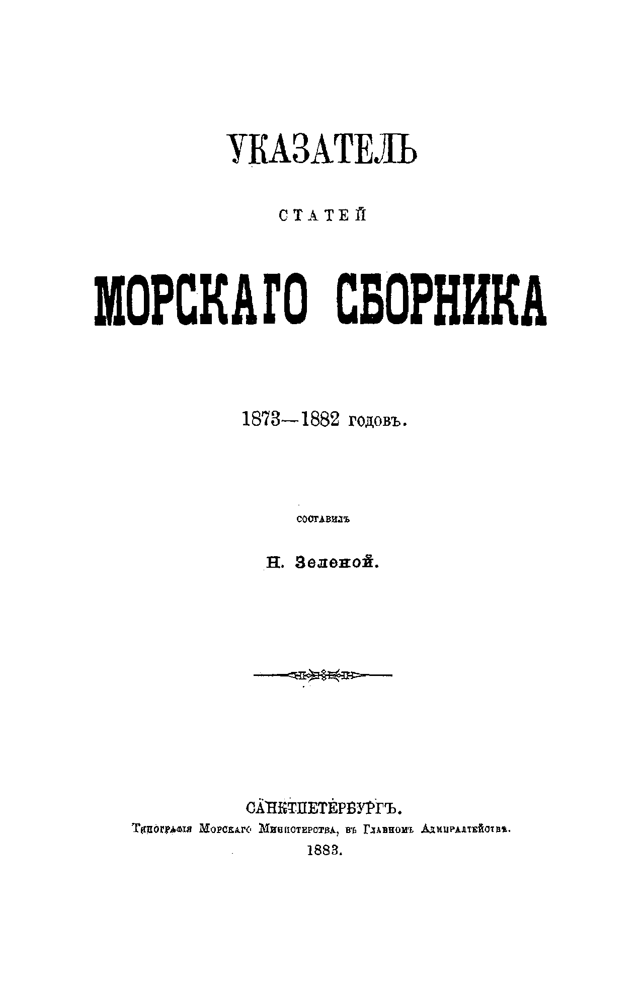 Продолжение (вторая часть) систематического указателя статей «Морского сборника» выполнил известный историк флота Н.И. Зеленой, который по поручению председателя Ученого отделения Морского технического комитета расширил это издание до 1882 г., полностью сохранив его структуру.