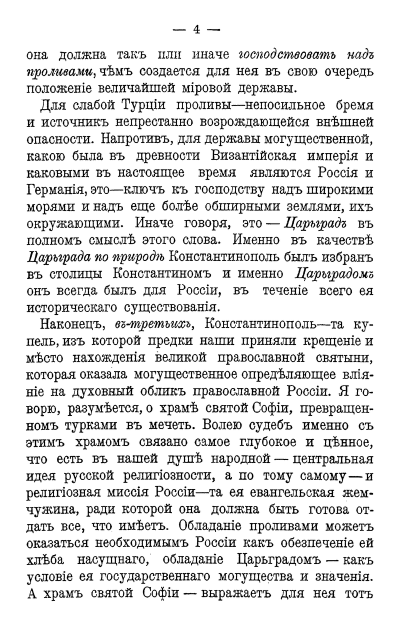 . Размышляя о войне и о месте Константинополя в русской истории, философ приходит к выводу о том, что осуществление Божьего замысла о софийном преображении твари предполагает возвращение Царьграда и Св. Софии в сферу православного мира. «Не для узко-националистической цели, – полагает автор, – а только во имя сверхнародного общечеловеческого смысла Россия может получить в свое обладание Царьград и проливы». Так историко-философский и богословский материал позволяет понять смысл событий и осветить геополитические проблемы.