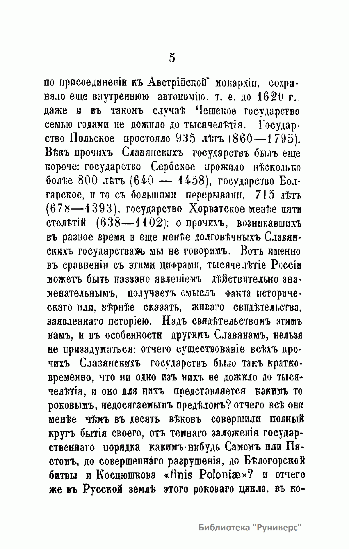 Популярная занимательная брошюра, посвященная предстоявшему в 1862 г. торжественному празднованию 1000-летия российской государственности (Тысячелетию России) принадлежит перу выдающегося отечественного славяноведа, прекрасного знатока истории, культуры, языка и верований славянских народов Александру Федоровичу Гильфердингу, автору значительных исследований в области общеславянской филологии. Автор, отмечая уникальность российской государственности, в весьма простой и доступной форме на примерах других славянских народов (государственных образований – мораван, чехов, поляков, словаков, хорватов, болгар и сербов), проводит сравнительный анализ причин распада славянских государств. Автор подробно останавливается на описании истории Чехии, оказавшейся, как и Польское государство, в орбите католической церкви и западноевропейской цивилизации в целом. Это «губительное», по мнению Гильфердинга, цивилизационное влияние настойчиво подавляло «стихию славянского начала», когда «Чешское государство стояло на высоте своего политического могущества». Именно этого удалось избежать российской национальной культуре, не подвергавшейся столь сильному влиянию западноевропейской (римско-католической, а затем протестантской) традиции, что и позволило восточнославянскому этносу сохранить свою самобытную государственность, достигнув тысячелетнего существования. Популярное исследование Гильфердинга весьма актуально в нынешних условиях преобразования современной России, отмечающей 1150-летие создания своей государственности.
