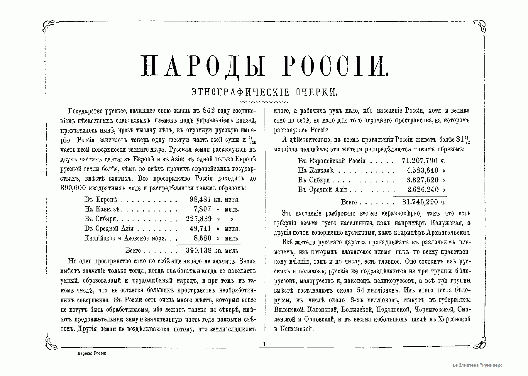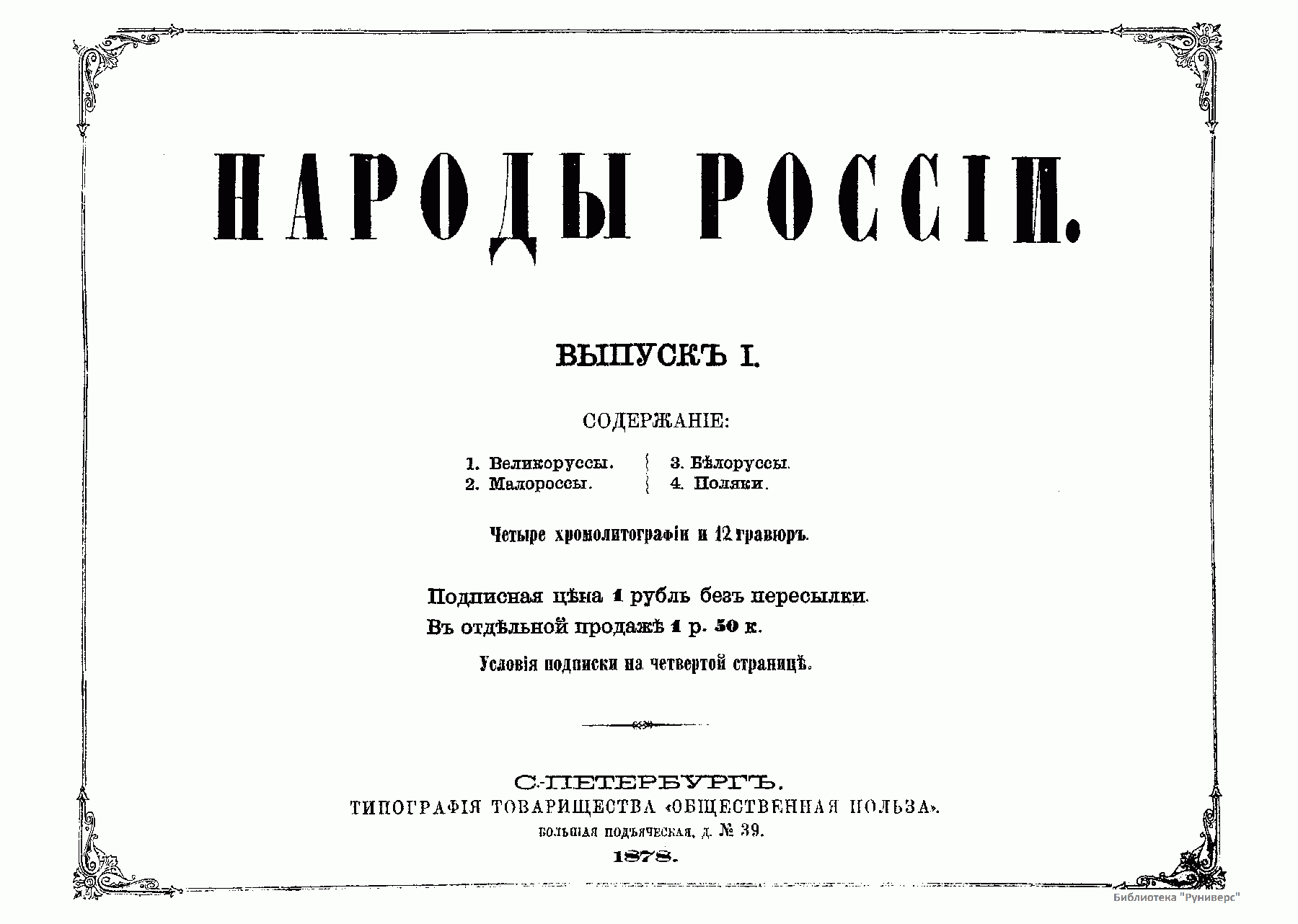 Масштабное научно-популярное исследование «Народы России», подготовленное известными российскими этнографами в период либеральных реформ Александра II, в эти годы пользовалось значительным читательским интересом. Это хорошо иллюстрированное обзорное издание, охватывающее необъятные географические и этнокультурные пространства, быт и нравы ногочисленных народов и народностей (выделено 45 основных народностей и народов), проживавших в Российской империи, и поныне представляется весьма познавательной книгой, далеко не потерявшей своей научно-практической значимости.