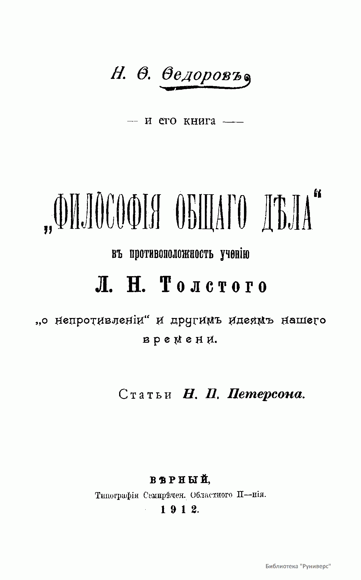 Н.Ф. Фёдоров и его книга "Философия общего дела" в противоположность учению Л.Н. Толстого "о непротивлении" и другим идеям нашего времени