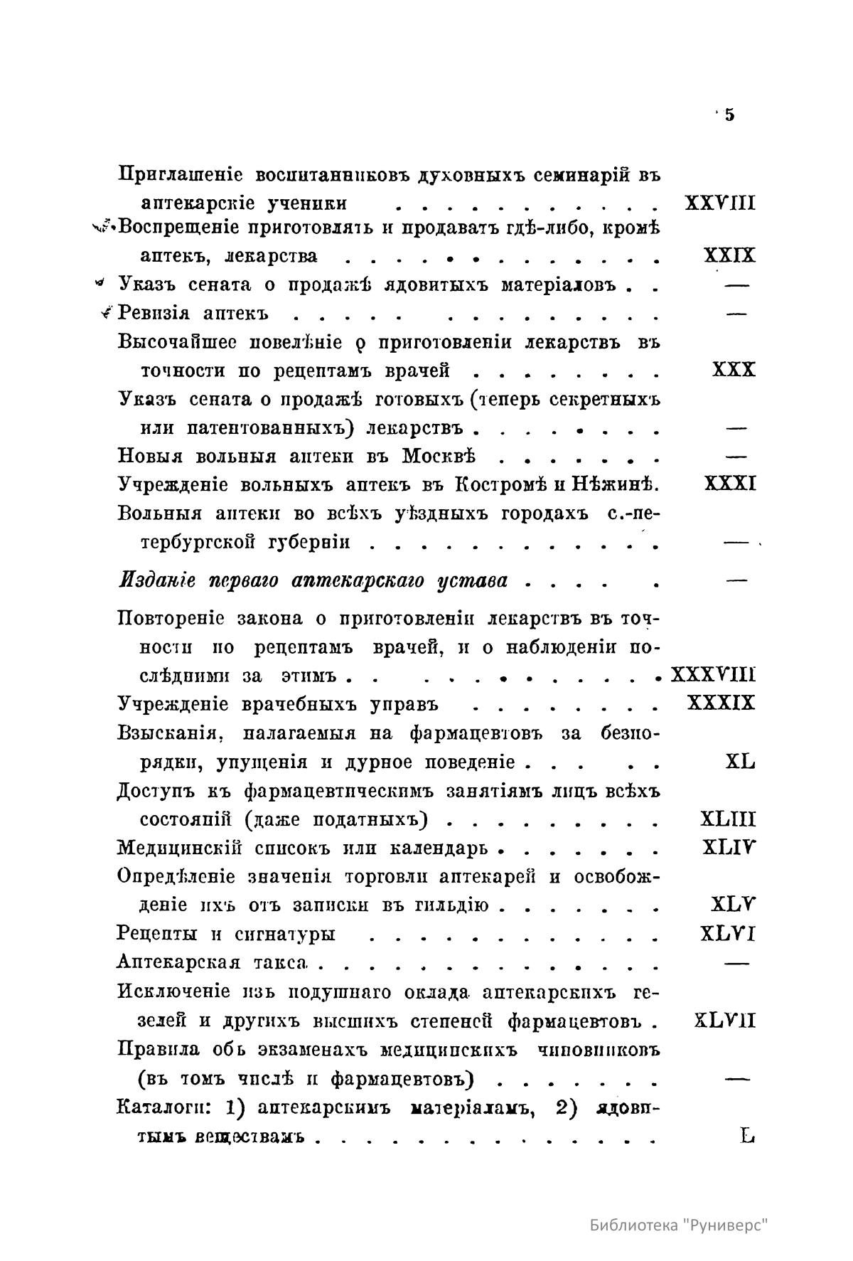 • Учреждение и устройство аптек: Приведены правила открытия новых аптечных заведений, нормы по количеству жителей и рецептов на одну аптеку, а также требования к внутреннему устройству помещений (лабораторий, материальных комнат, ледников),,,.