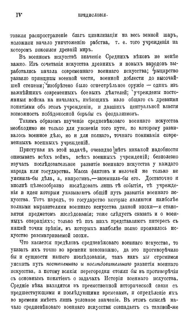 Изучение средневекового военного искусства необходимо не только для уяснения того пути, по которому развивалось военное дело, но и для полного точного понимания современных военных учреждений. Решая эту задачу, автор считает бесполезным излагать последовательно историю военного искусства у каждого народа и государства. Предметом исследования являются тот народ, то государство и те военные операции, которые наиболее полно выражают военное искусство данной эпохи.