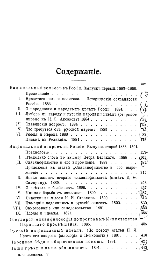 В первые два тома вошли его философские сочинения 1873-1880 гг., в третий – богословские 1877-1884 гг., в четвертом собраны работы, посвященные Церкви 1883-1887 гг., в пятом – публицистические произведения, включая «Национальный вопрос в России», том шестой объединяет критические сочинения, работы по эстетике и труды исторического характера, седьмой том посвящен нравственной философии, а в заключительных томах представлены сочинения последних лет жизни Соловьева.
