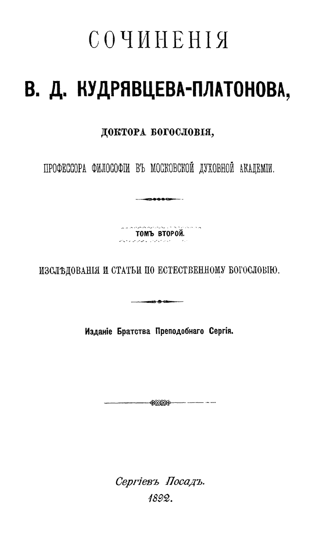 Посмертное издание собрания сочинений видного представителя русского теизма – профессора Московской Духовной академии и Председателя Братства Преподобного Сергия. Несмотря на то, что в истории русской философии Кудрявцев-Платонов не получил известности как основатель оригинальной философской системы, его по праву считают превосходным философским писателем и талантливым выразителем идеи непротиворечивого сочетания философского миросозерцания и христианского учения.