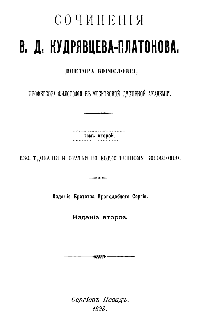 Посмертное издание собрания сочинений видного представителя русского теизма – профессора Московской Духовной академии и Председателя Братства Преподобного Сергия. Несмотря на то, что в истории русской философии Кудрявцев-Платонов не получил известности как основатель оригинальной философской системы, его по праву считают превосходным философским писателем и талантливым выразителем идеи непротиворечивого сочетания философского миросозерцания и христианского учения.