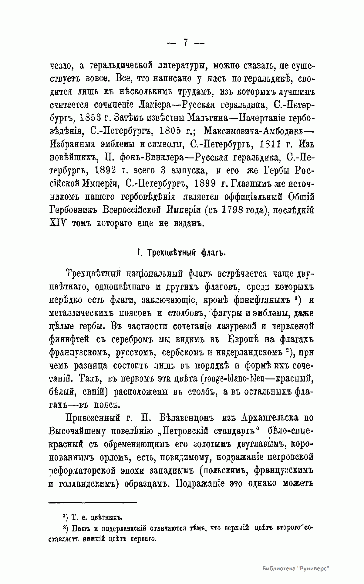 Издание адресовано тем, кто интересуется геральдикой. Автор рассматривает следующие вопросы: 1. Общие правила геральдики, разъяснение особых терминов. 2. Трехцветный флаг. 3. Петровские новшества по составлению флага. 4. Петровский стандарт, привезенный из Архангельска. 5. Другие отрицательные качества Архангельского трехцветного стандарта и ему подобных. 6. Цвета национального флага. 7. Характерность национального флага как важное условие его популярности. 8. Двуглавый российский орел и его применение на флаге. 9. Проекты реформ национального флага. 10. Военный флаг и флаги других ведомств. 11. Неправильности изображение национальных отличий.