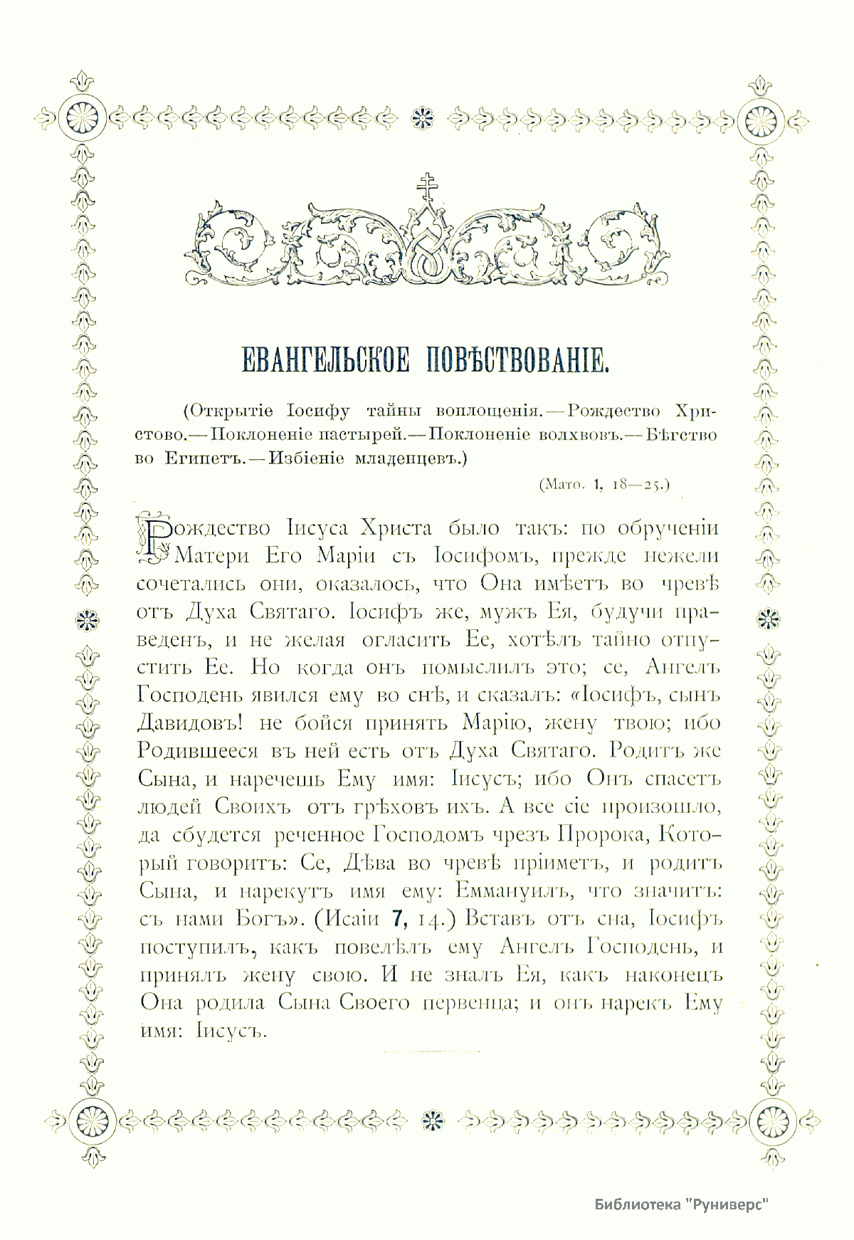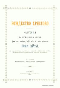 Рождество Христово – один из главных христианских праздников, установленных, согласно церковному вероучению, в честь рождения Христа. Отмечается 25 декабря (в одних странах по новому стилю, в других – по старому, что соответствует 7 января нового стиля). Праздничное издание Московской Синодальной типографии представляет собой сборник текстов на Рождество Христово. Это рассказы из Евангелия, Четий-Миней, слова Григория Богослова, Филарета – митрополита Московского, Макария – митрополита Московского, сочинения Иеронима – архиепископа Холмско-Варшавского, беседы Иннокентия – архиепископа Херсонского. В сборник включена праздничная церковная служба на церковнославянском языке с примечаниями и нотным приложением песнопений.