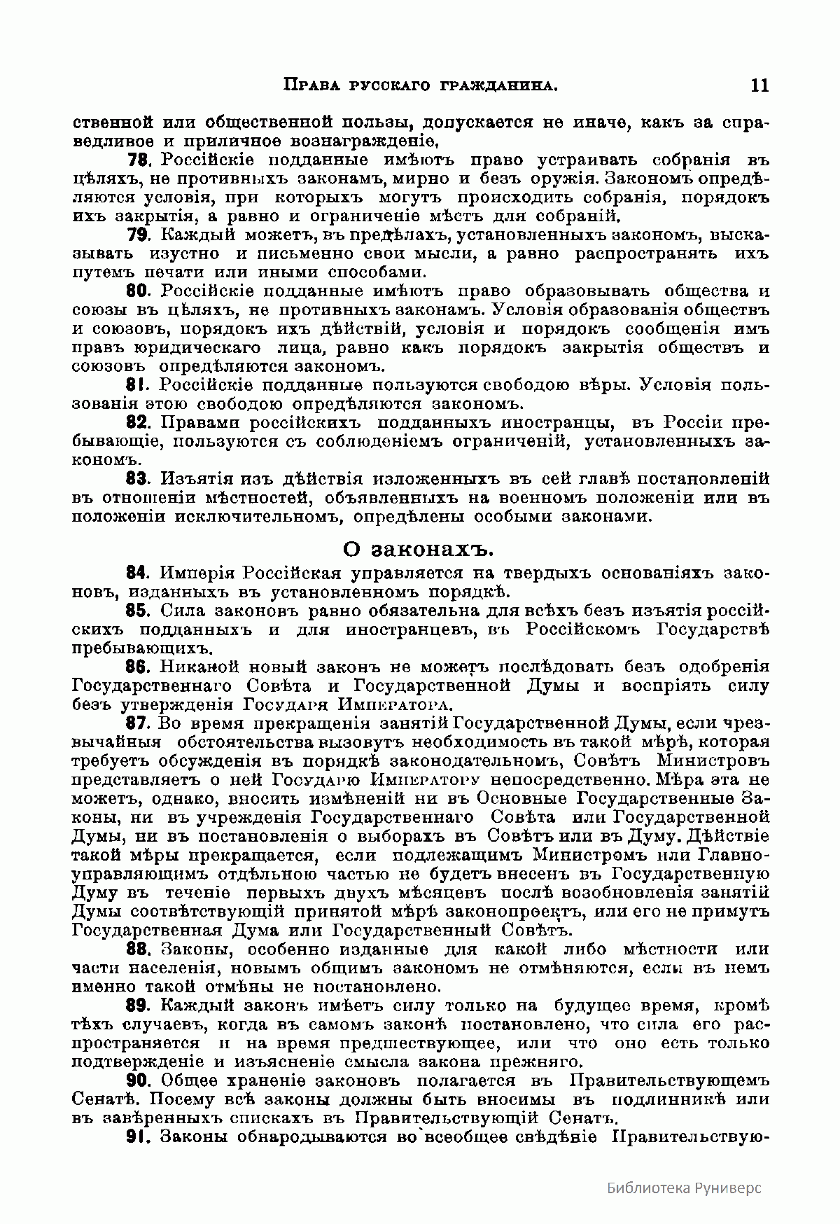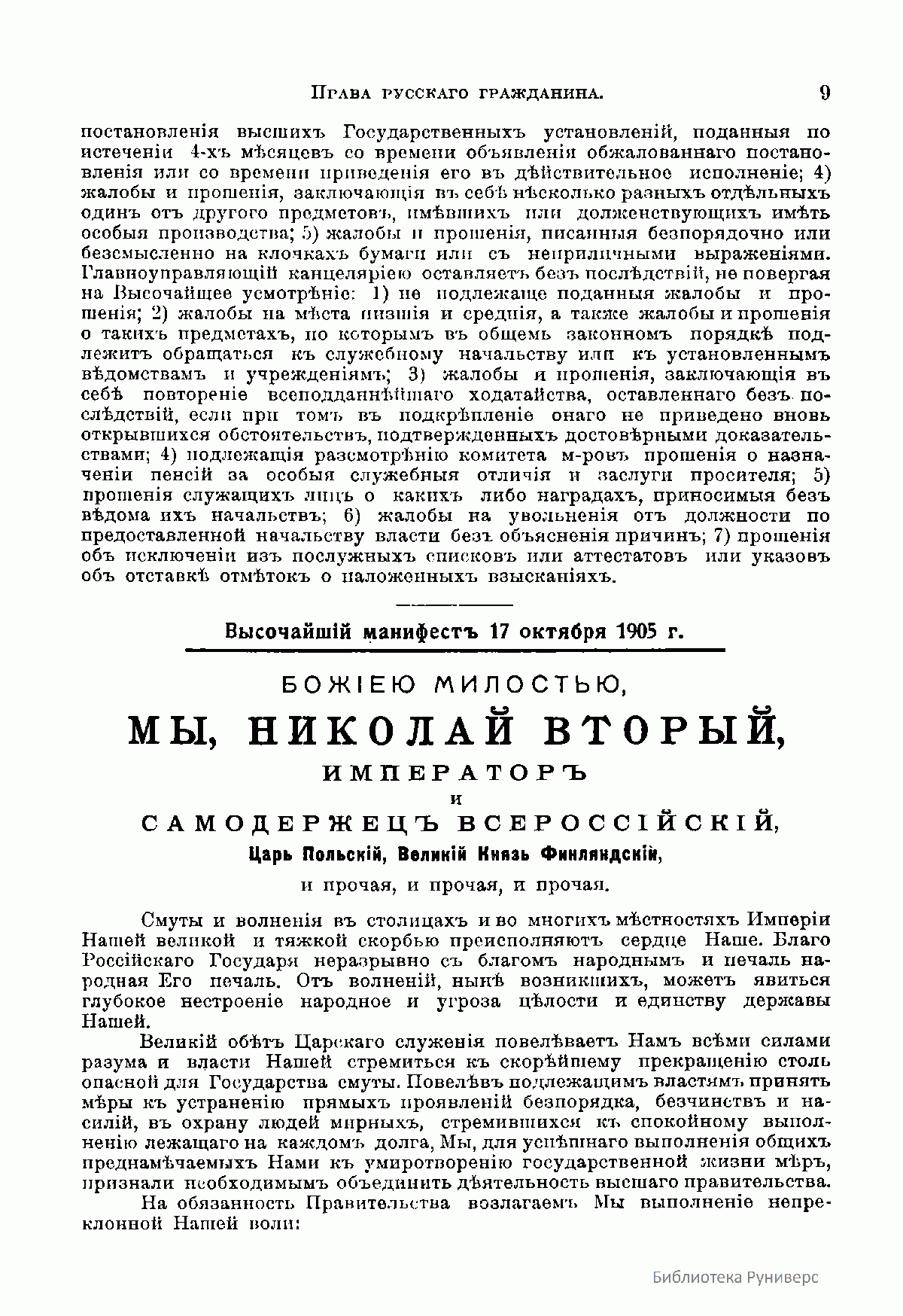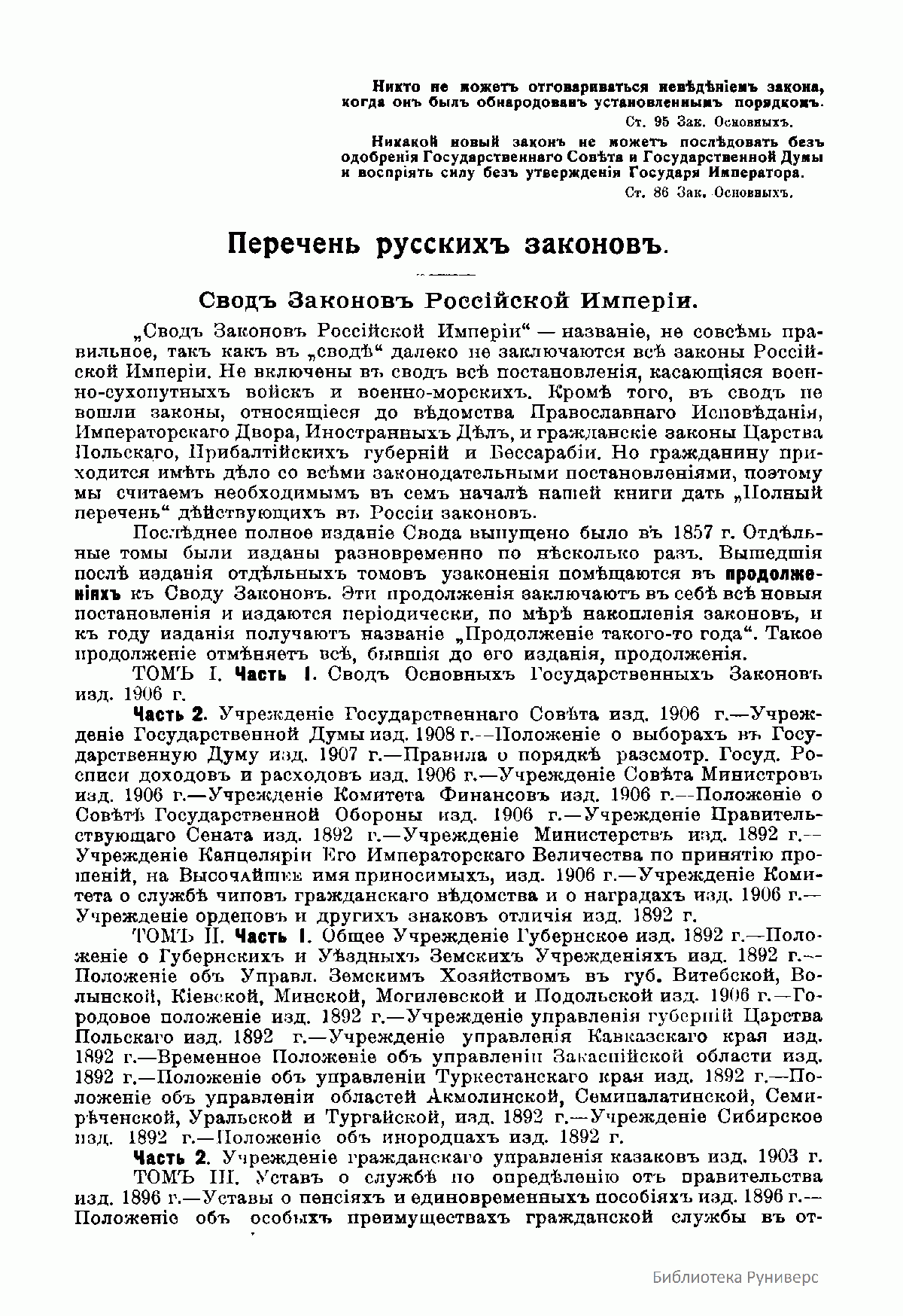 С переходом России к представительному образу правления с регулярно действующим законодательным установлением, право является могучим регулятором жизни. Оно пронизывает теперь как всю частную и публичную жизнь граждан, так и все государственные и общественные учреждения. Поэтому знанием законов и, прежде всего, тех, которые чаще касаются жизни граждан и способов осуществления своих прав, является настоятельной необходимостью для каждого. Законодательство никогда не останавливается, оно идет рука об руку с действительностью. Сухие нормы права оживают, соприкоснувшись с действительностью. Это согласование прав и жизни находит свое выражение в регулирующей деятельности Сената. Само собой понятно, что следить за законодательной деятельностью Думы и судебной – Сената для рядового гражданина, занятого своими делами и обязанностями, затруднительно, а знать свои права необходимо. Как же узнать свои права? Как их осуществить, и как поступать в случае их нарушения? С целью содействия посильному разрешению этих вопросов и составлена эта книга. Общий план книги таков: книга состоит из двух частей. В первой – приведены все законы, касающиеся различных прав гражданина, в ней указывается, что надо делать для осуществления своего права путем указания на саму статью закона. Во второй части книги указывается, как надо сделать, какую написать бумагу, куда ее подать, – словом, как фактически осуществить свое право или добиться восстановления нарушенного права путем обжалования незакономерных действий административных лиц.