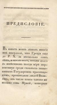 Издание «Семь греческих мудрецов, или Краткое историческое описание их жизни, свойств и деяний...», как явствует из «Предисловия» автора, «доселе на отечественном языке издаваемо не было». И это действительно так. Автор пишет, что «нравственные и исторические книги» желаемы многими, а это значит, что читатель той эпохи испытывал недостаток в такого рода чтении. Выбрав из истории Греции семь мужей, которые удостоились «названия Мудрых», автор сложил для юного читателя небольшую книгу из семи рассказов. Каждый включал в себя известные изречения каждого из семи мудрецов, краткую биографию с указанием подвигов и приложением портретов, которые, несомненно, были условными.