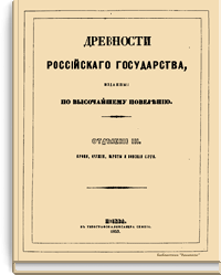 Авторы настоящего издания считают, что время охранения памятников России настало со вступления на престол Императора Николая I. Повелевая хранить памятники и остатки русских древностей, он приказал все, что заслуживает внимание и составляет материал истории, отчетливо срисовать, описать и издать. Император повелел учредить в Москве Комитет издания древностей Российского государства. Первый отдел огромного и великолепного издания «Древности Российского государства» состоит из 500 большого формата рисунков, распределенных по своему содержанию на шесть частей с соответствующим описанием. Первая часть «Древностей» заключает в себе священные памятники: а) образа и кресты, замечательные в историческом и художественном отношении, б) храмовую утварь разных времен, в) облачения духовного сана. Вторая часть содержит древний царский чин, или священное облачение русских великих князей и царей при поставлении на царство. В третьей части представлена древняя броня и оружие. Четвертую часть составляют древние великокняжеские, царские, боярские и местные народные одежды в изображениях и портретах. В пятой части можно увидеть древнюю царскую столовую утварь. Шестая часть состоит из памятников древнего русского зодчества.