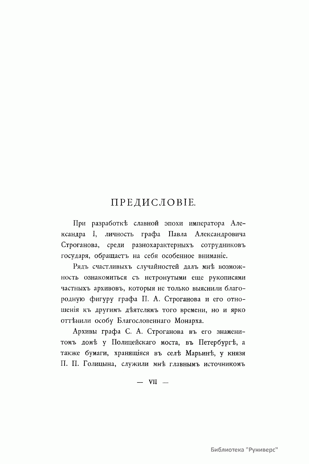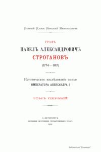 Данное историческое исследование великого князя Николая Михайловича дает наиболее полное представление о жизни и деятельности графа Строганова. Представленная биография разделена на пять глав, освещающих отдельные периоды его жизни и деятельности. Первая глава посвящена родителям графа Строганова и особенно его отцу, графу Александру Сергеевичу; вторая – воспитанию графа и его наставнику; третья – эпохе «Комитета общественной безопасности»; четвертая – лондонской миссии; пятая – военной деятельности. В издании помещены многочисленные приложения, дающие возможность ознакомиться с целой серией не изданных до того времени документов.