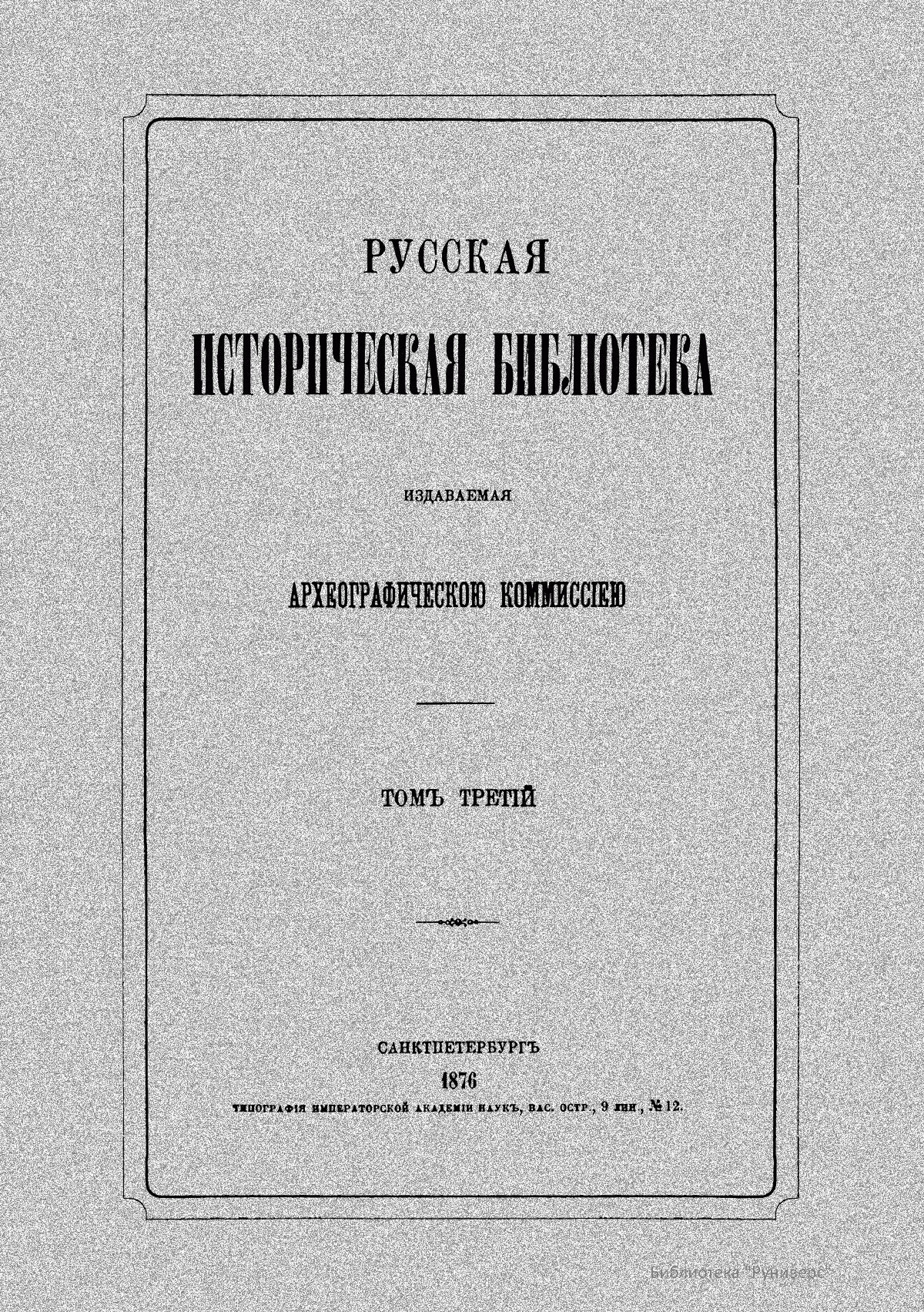 Русская историческая библiотека, издаваемая Археографическою комиссiею. Томъ третiй