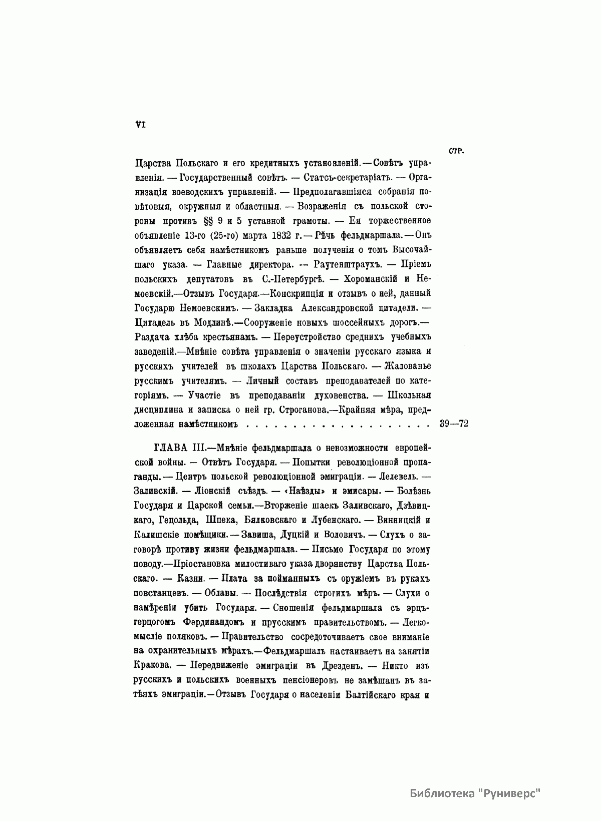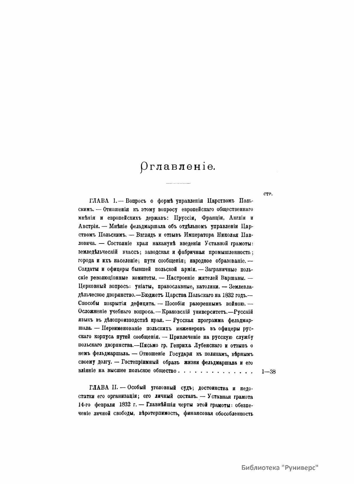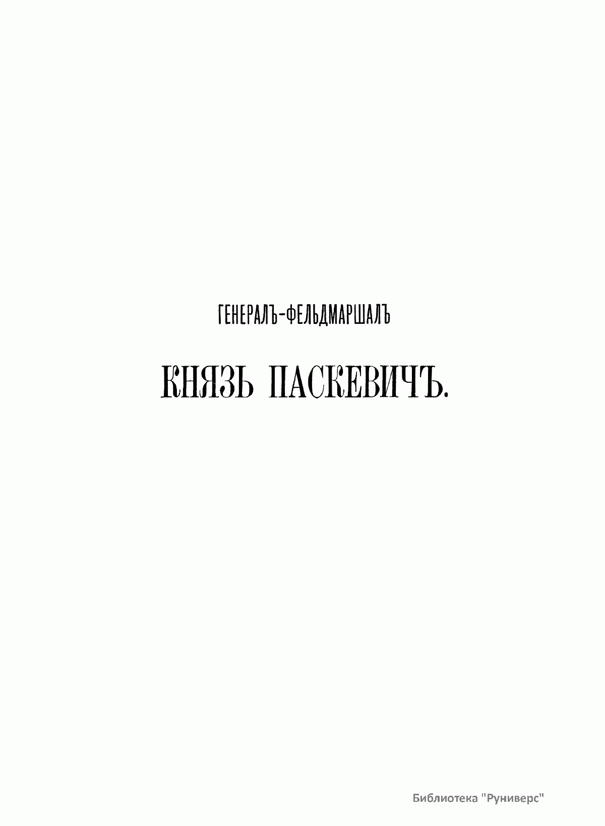 Данное издание князя Александра Петровича Щербатова (1836– ? ) представляет собой полное жизнеописание Ивана Федоровича Паскевича (1782–1856) — графа Эриванского (1828), светлейшего князя Варшавского (1831), видного российского военного и государственного деятеля. Иван Федорович Паскевич участвовал в русско-турецкой войне 1806–1812 гг. Во время Отечественной войны 1812 г. и заграничных походов 1813–1814 гг. командовал дивизией. В 1817–1819 гг. состоял при великом князе Михаиле Павловиче, затем командовал гвардейской пехотной дивизией, в которой служил будущий император Николай I, что способствовало быстрой карьере Паскевича, ставшего одним из наиболее близких к Николаю I лиц. Был членом Верховного суда по делу декабристов. С 1826 г. командовал войсками в Закавказье, в марте 1827 г. стал наместником на Кавказе. Во время русско-иранской и русско-турецкой войн был главнокомандующим войсками на Кавказском театре военных действий. Руководил подавлением Польского восстания 1830–1831 гг., после чего был назначен наместником Царства Польского, проводил политику национального угнетения и русификации. В 1849 г. командовал войсками при подавлении Венгерской революции (1848–1849). Во время Крымской войны (1853–1856) был главнокомандующим войсками на западных границах и на Дунае. Этот капитальный труд, основанный на подлинных архивных документах, иллюстрируют планы сражений и карты театров военных действий, в которых принимал участие И. Ф. Паскевич.