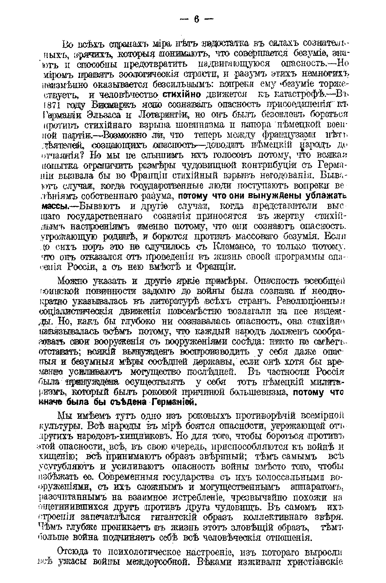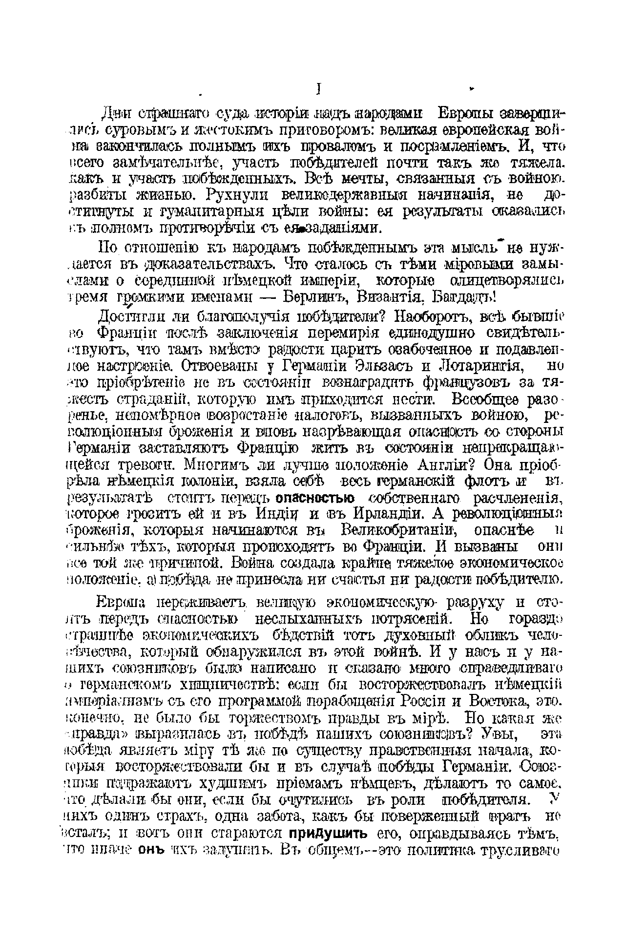 Автор книги стремится осмыслить настоящее (1919 год) и будущее России. Он учитывает итоги европейской политики XIX века, результаты Первой мировой войны, революции 1917 года. В небольшой по объему работе обсуждается извечная проблема внутренних и внешних врагов страны, говорится о явных и скрытых причинах упадка и гибели империи, о взаимоотношениях народа и власти, масс и элит, о соотношении духовного и материального. Философ дает ответ на вопрос: что же восторжествует в мире – «звериное или человеческое»?