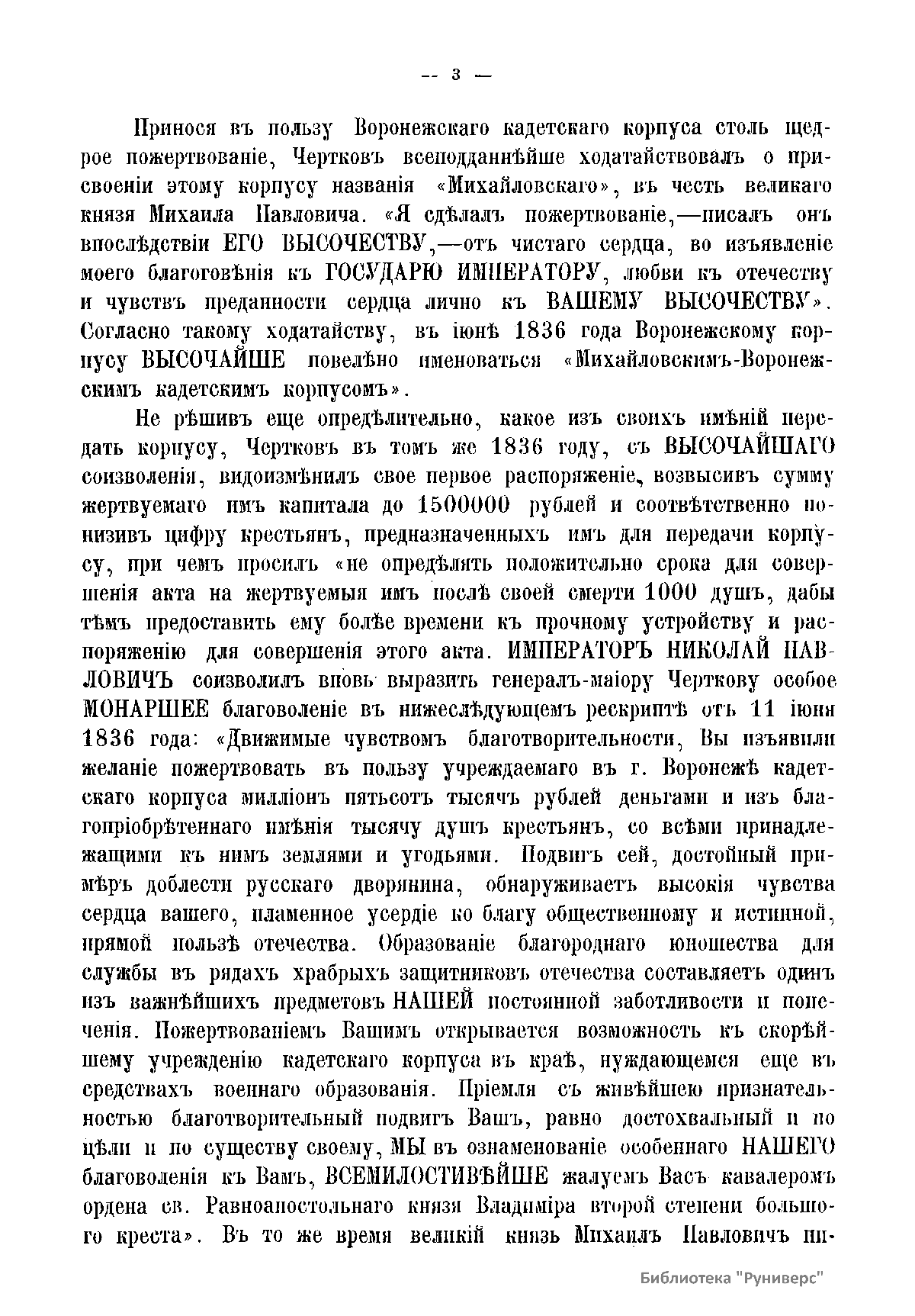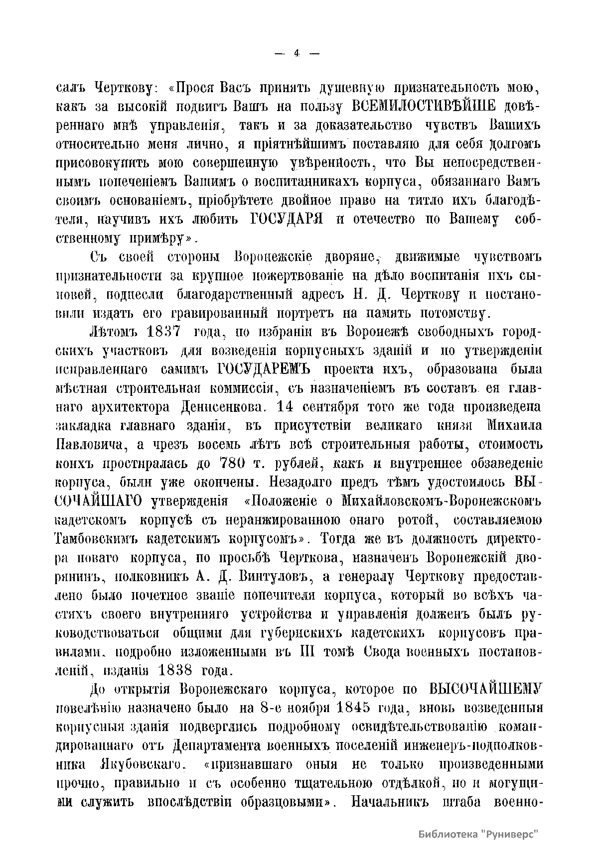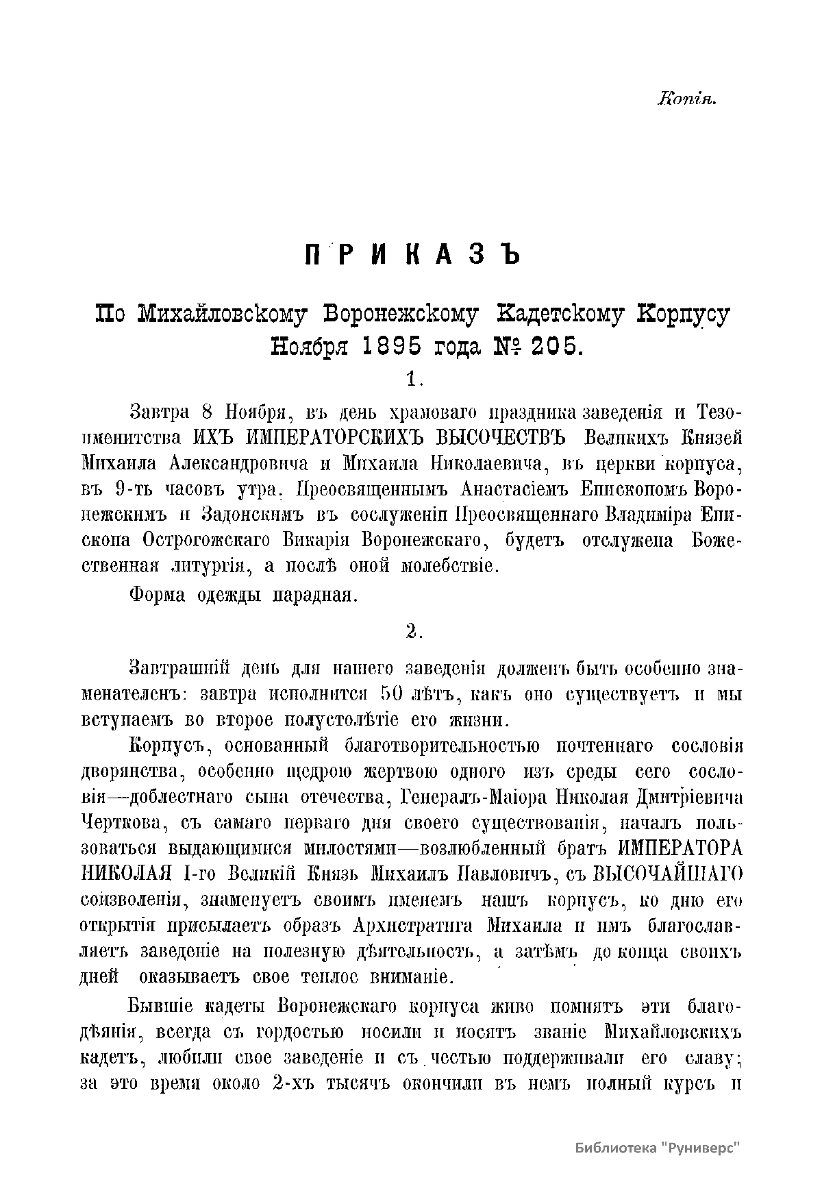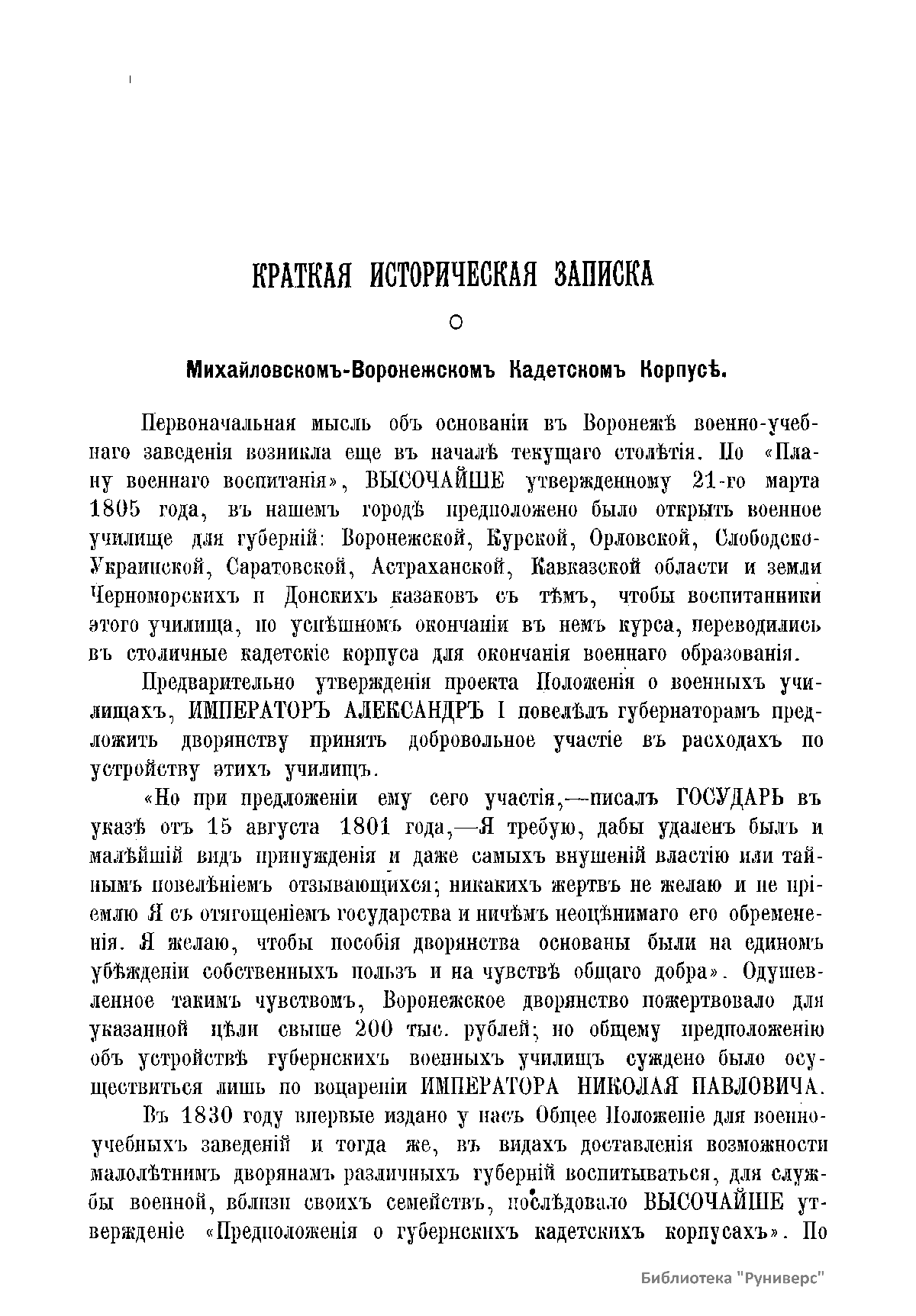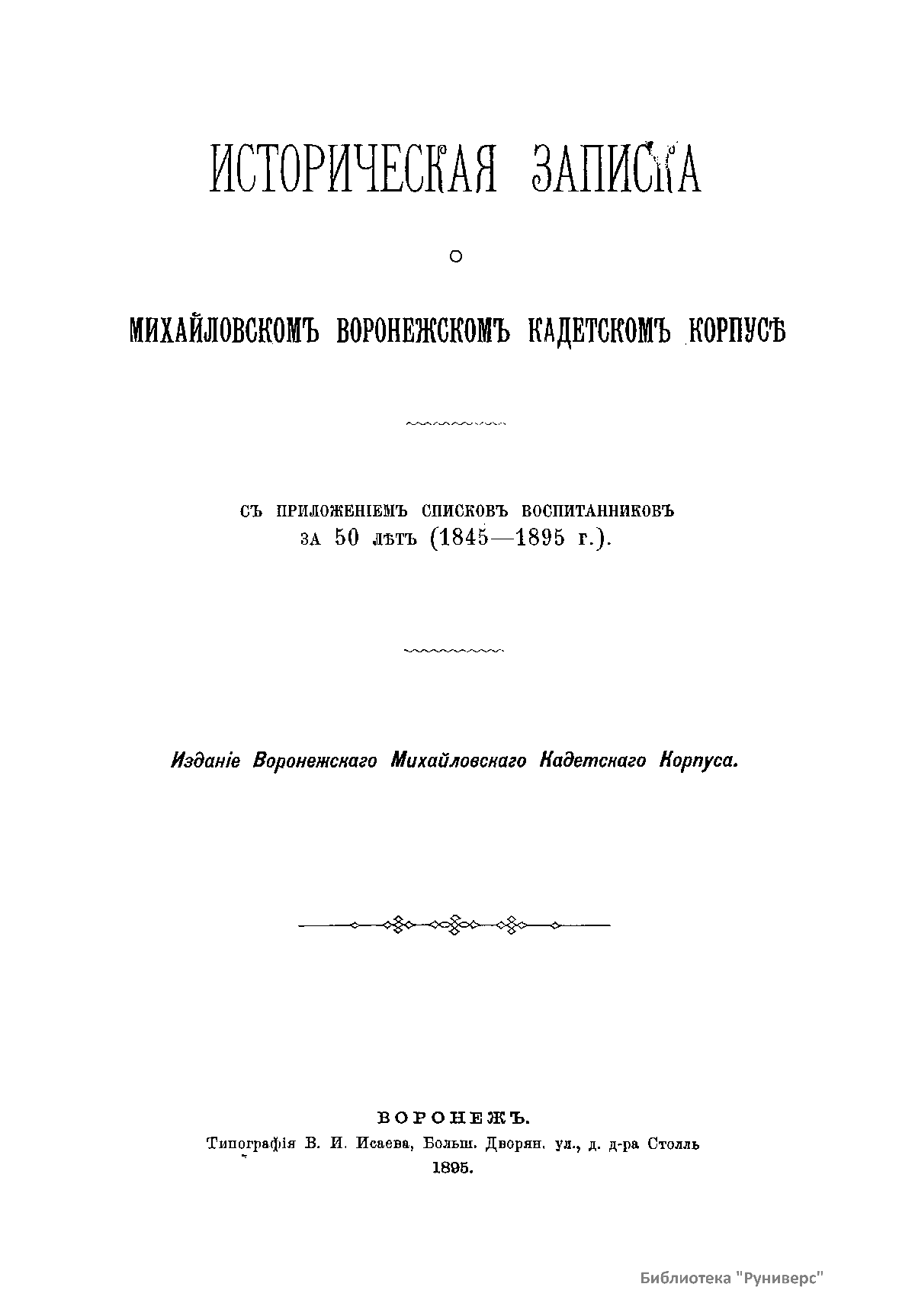 Историческая записка о Михайловском Воронежском кадетском корпусе