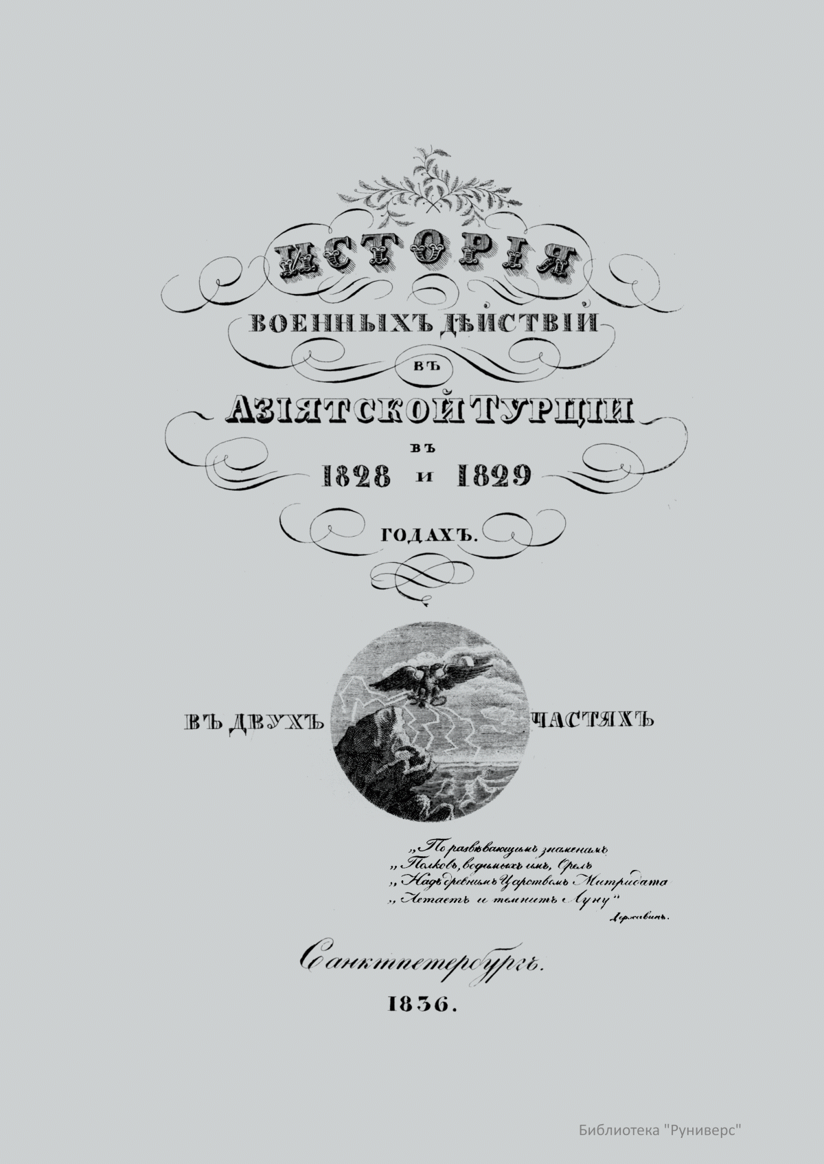 Данное издание Николая Ивановича Ушакова (1802–1861) посвящено событиям Русско-турецкой войны 1828–1829 гг. Повествование о боевых действиях в Азиатской Турции предваряет описание российских владений за Кавказом, а также сопредельных областей Азиатской Турции. Издание, написанное на основании официальных документов и материалов, содержит ценные исторические и статистические сведения, не утратившие своей актуальности и сегодня. Впервые книга была издана в 1836 г. в Санкт-Петербурге, и состояла из двух частей исторического описания. Второе издание увидело свет в Варшаве в 1843 г.; к абсолютно идентичному первому изданию тексту был добавлен картографический материал с планами осад, крепостей и сражений.