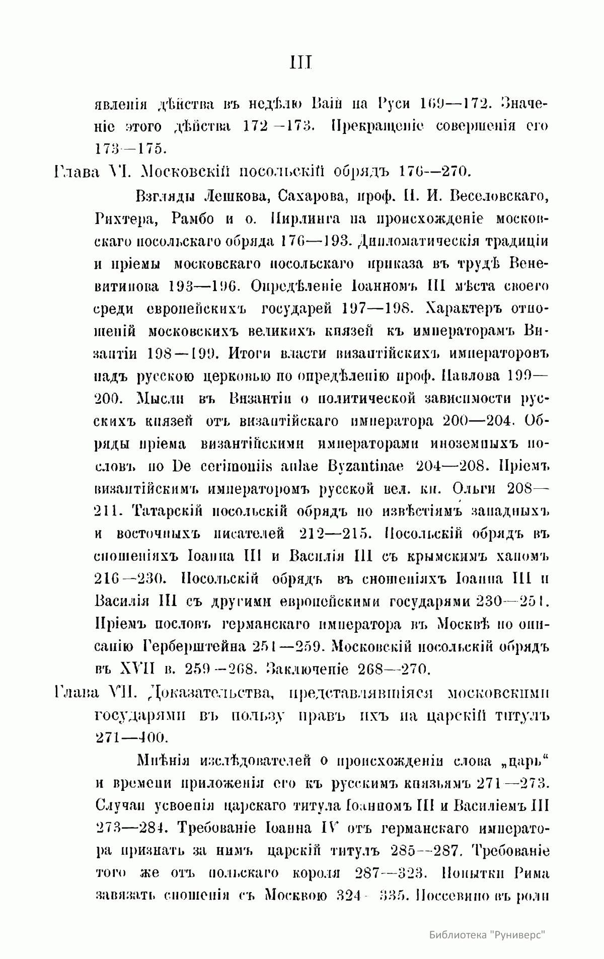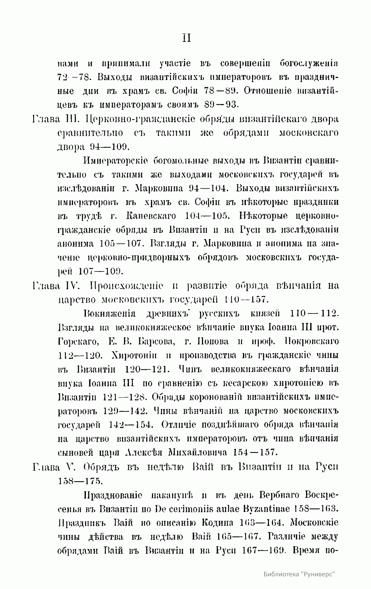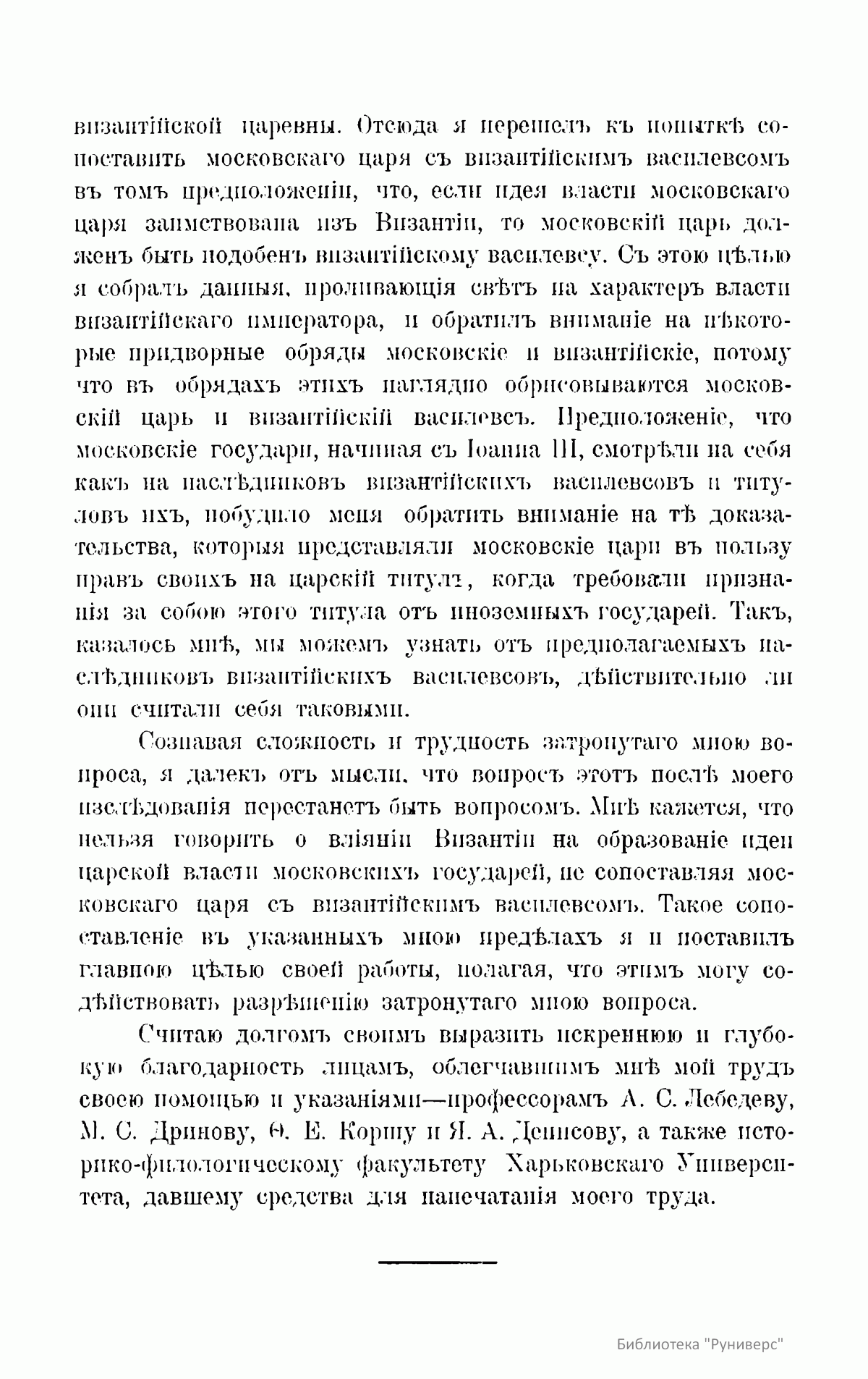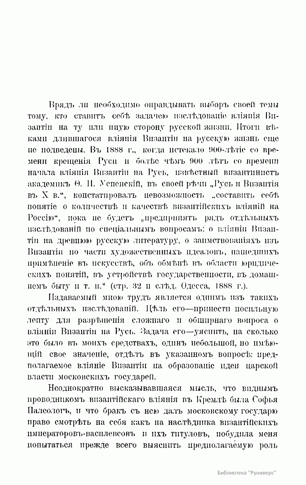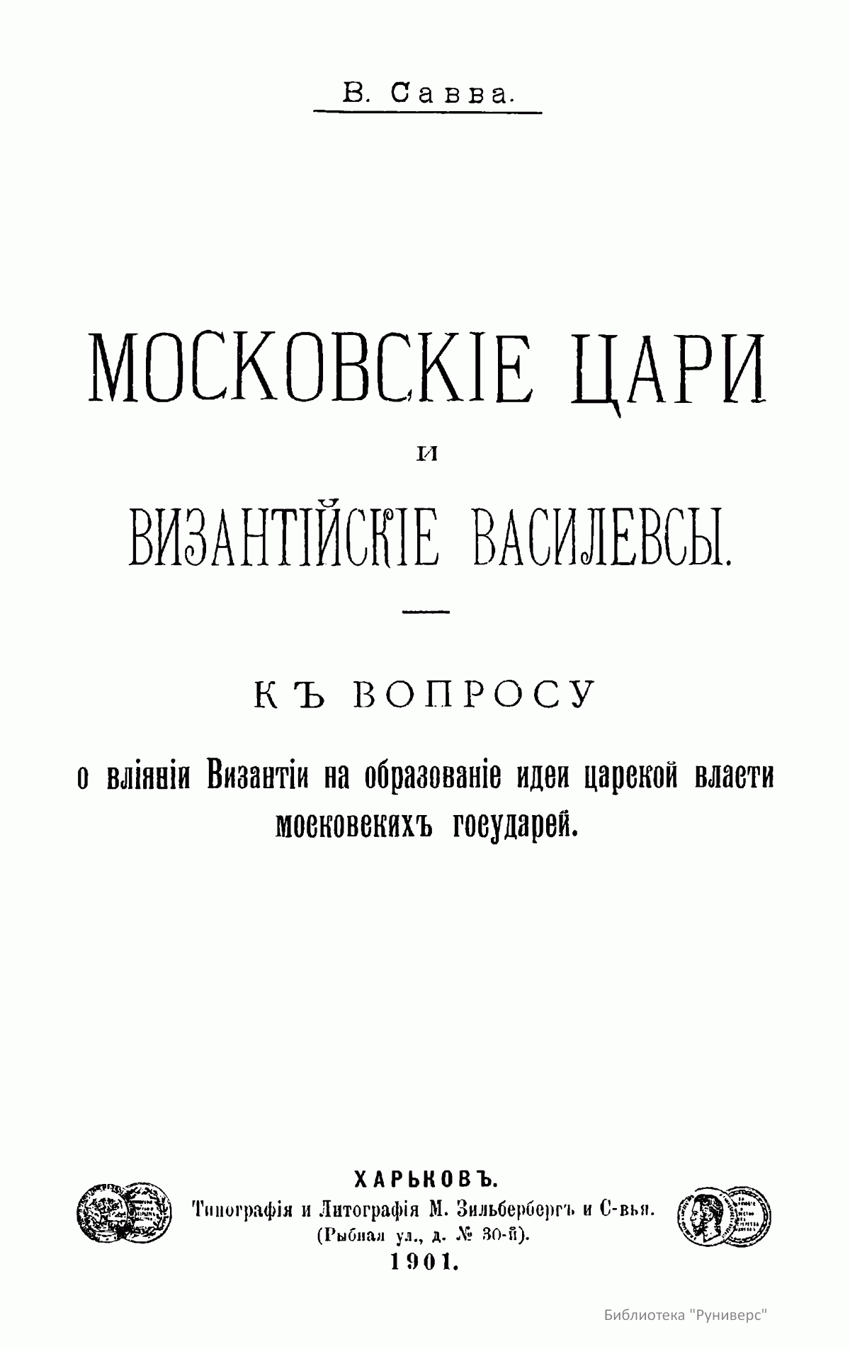 В настоящем издании рассматривается вопрос о влиянии Византии на образование идеи царской власти московских государей. Автор ставит перед собой цель внести посильную лепту в разрешение сложного и обширного вопроса о влиянии Византии на Русь. В 1888 году, когда истекало 900-летие со времени крещения Руси и более 900 лет со времени начала влияния Византии на Русь, известный византинист академик Ф. И. Успенский в своей речи «Русь и Византия в X веке» констатировал невозможность «составить себе понятие о количестве и качестве византийских влияний на Россию», пока не будет предпринят «ряд исследований по отдельным вопросам: о влиянии Византии на древнюю русскую литературу; о заимствованиях по части художественных идеалов, нашедших применение в искусстве; об обмене в области юридических понятий; в устройстве государственности; в домашнем быту и т. п.». Предлагаемый труд является одним из таких исследований. В книге говорится о роли Софьи Палеолог как проводнике византийского влияния в Кремле; о пространстве и характере власти византийского императора; о церковно-гражданских обрядах византийского двора сравнительно с такими же обрядами московского двора; о происхождении и развитии обряда венчания на царство московских государей; об обряде в неделю Ваий в Византии и на Руси; о московском посольском обряде; о доказательствах, представлявшихся московскими государями в пользу прав их на царский титул.
